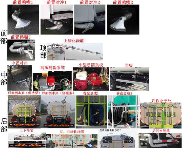 该车装有水罐、水路系统、作业平台、控制系统,用于清洗作业;罐体外形尺寸(长轴×短轴×长度)(mm):2400×1420×6100.该车罐体总容量14.6立方米;罐体有效容积13.9立方米;采用底盘4350+1350mm轴距;侧防护装置材料为铝合金,连接方式为螺栓连接,可选装其局部外观;后防护装置材料为Q345A,与车辆连接方式为螺栓连接;后部防护装置的断面尺寸为240×65mm,离地高度为415mm.该车可选装鸭嘴,对冲,上绿化浇灌,高压清洗系统,小型喷洒系统,自吸,后部洒水架(保洁型、浇灌型),卷盘,后作业平台,上下喷雾,左右绿化浇灌,后作业指示灯2,后回水管路,该系列选装对于整车尺寸,重量变化可忽略不计;随底盘装有ABS,ABS系统生产厂家:长春瑞立科密汽车电子有限公司,型号:CM4XL. |