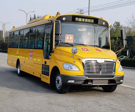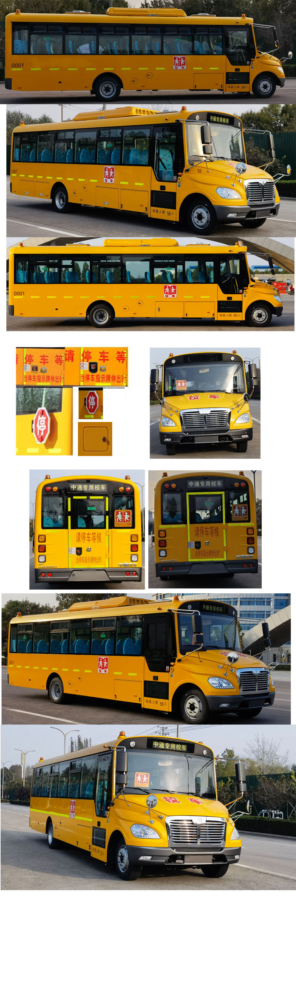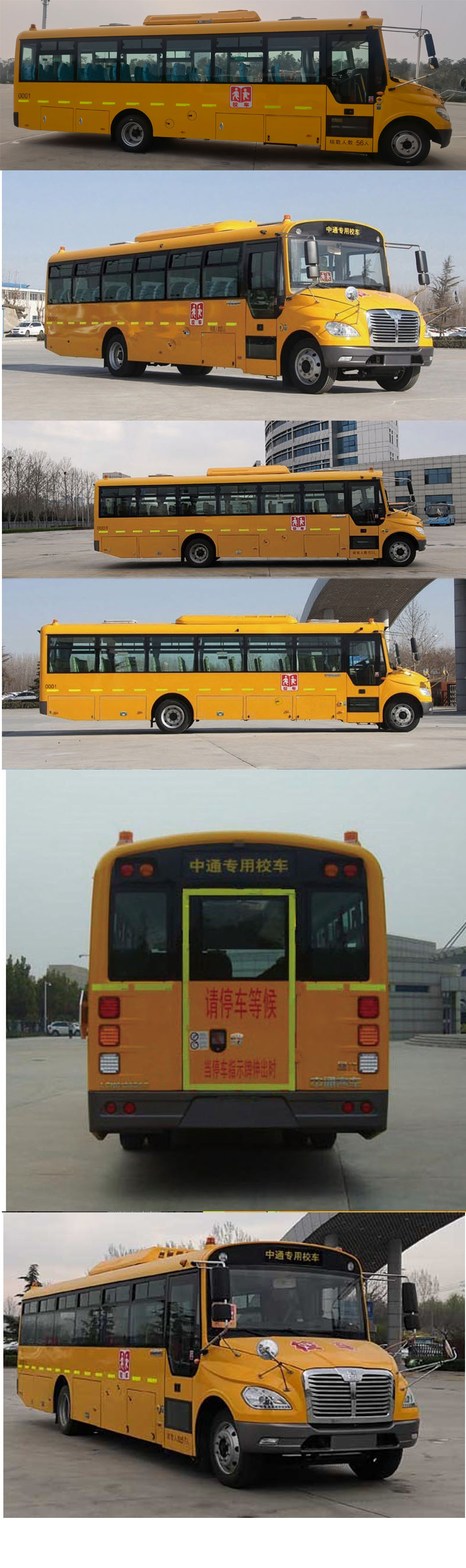 中通牌56座小学生专用校车的外形尺寸为9780×2500×3220,3150,3110,3160,3050,2980(mm),整车的总质量为12000,10600(kg),整备质量为8600,8300,7700,7840,7500(kg),整车的外形强大,结实硬朗,给人不一样的视觉冲击。