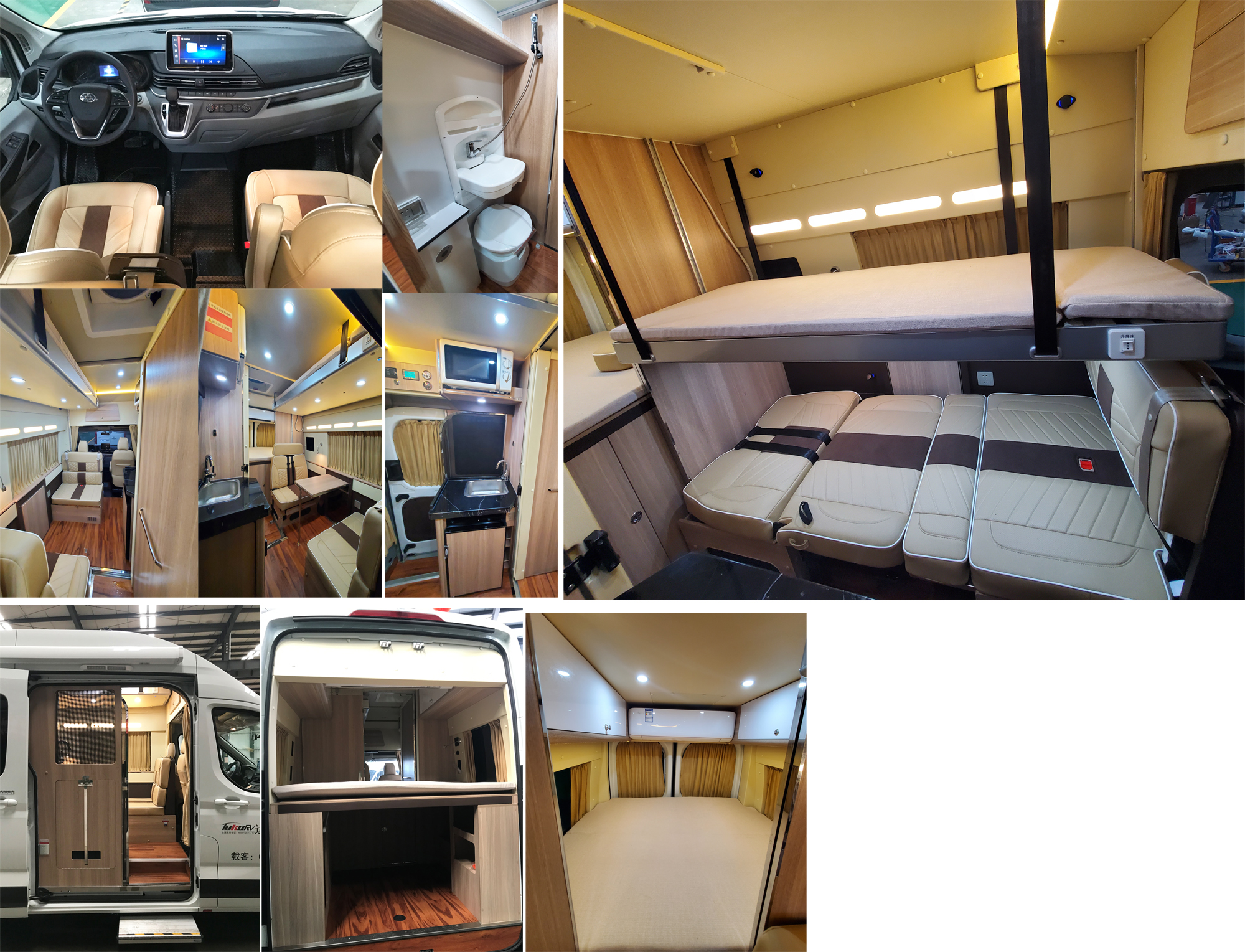 该车型选装中顶(车高为2520mm,2495mm).该车可选装散热器格栅、前大灯、日间行车灯、后尾灯、轮圈、轮饰盖、尾门标识、移门侧踏步、同平面推拉窗、固定粘结式窗、后门开启限制、车身外侧饰板、可选装ETC车载装置.该车可不装前雾灯、后摄像头.ABS型号:ABS 9,ESP9,ABS生产企业:博世汽车部件(苏州)有限公司,博世汽车部件(苏州)有限公司.发动机最大净功率:108.5kW.该车装配手动变速器时最高车速为145km/h;装配自动变速器时最高车速为150km/h.随原车选装中顶车身时,高度为2520mm,中顶车身加换气扇时,高度为2600mm.车顶不选装设备或太阳能板,车高2735mm;选装换气扇,车高2860mm、选装行李架,车高2800mm.专用装置为床铺、洗手盆、卫生间旅居生活设施、空调、电视等生活生活设施;卧具由座椅转换而成. |
