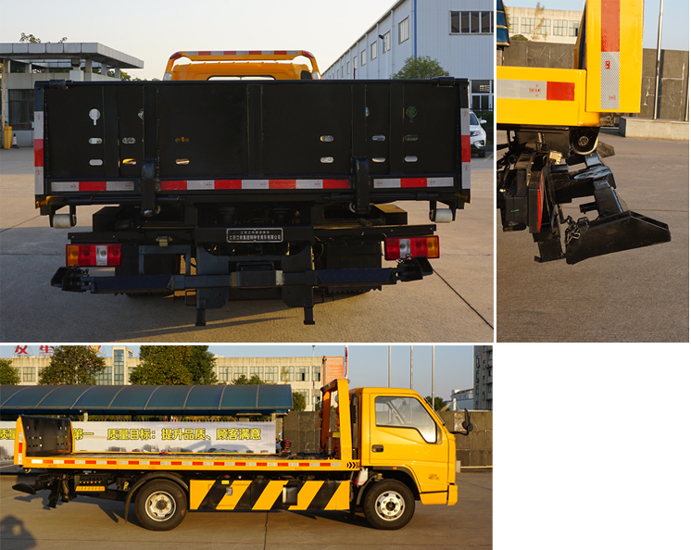 备注 | 1.托举质量1900kg,1500kg, 2.随底盘选装前脸样式。选装后部拖臂结构,当选装后拖臂结构时后部防护装置由专用装置替代离地高度为540毫米, 3.液刹ABS系统型号:APG3550500A,ABS系统生产厂家:浙江亚太机电股份有限公司;气刹ABS系统型号: VIE ABS-II,ABS系统生产厂家: 浙江万安科技股份有限公司4. 侧面防护材料:Q235,连接方式:螺栓连接; 后下部防护装置材料:Q235,连接方式:螺栓连接,断面尺寸:100毫米×60毫米,离地高度:450毫米。该车主要用于道路车辆清障,主要专用装置为绞盘,托举装置,钢丝绳,平板机构。 |