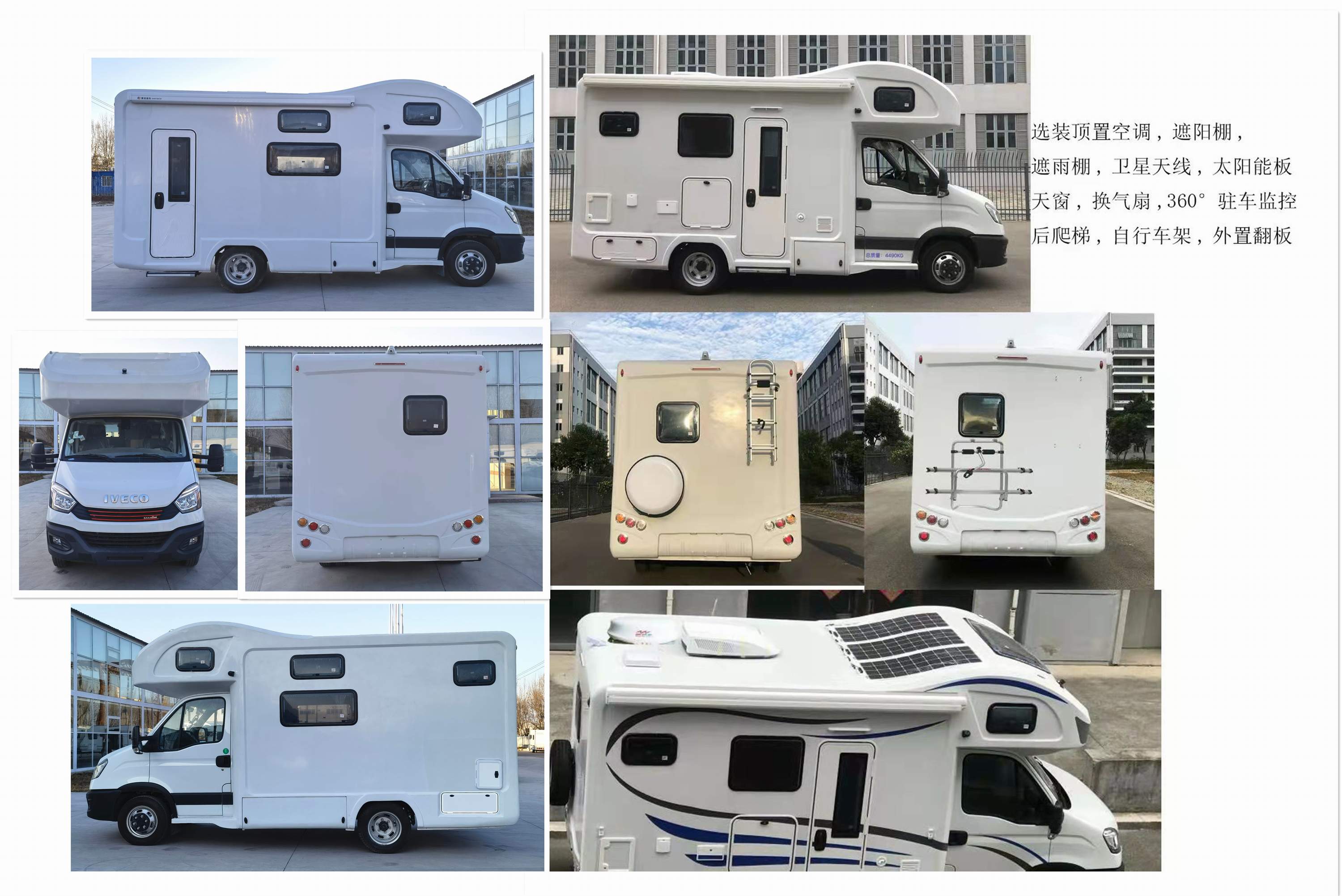 该车设有睡具,炊具,卫生间设施,空调,220V市电接口及必要照明等设备.用于旅居专用车辆.该车侧面和后部结构为整体式裙边结构,以满足防护要求.侧面防护结构离地高度320mm,后部防护结构离地高度380mm.该车可选装顶置空调,遮阳棚,遮雨棚,卫星天线,太阳能板,天窗,换气扇,360°驻车监控,后爬梯,自行车架,外置翻板,选装内部布置.该车选装顶置空调时高度为3180mm,选装遮阳棚时宽度为2440mm,同时选装360°监控时宽度为2500mm.选装箱体两侧及后部门窗时,依据布局需求可改变位置与大小.ABS型号:BOSCHABS9,BOSCHESP99,ABS生产企业:BOSCH公司,发动机型号:F1CE8481K,最大净功率123kW |