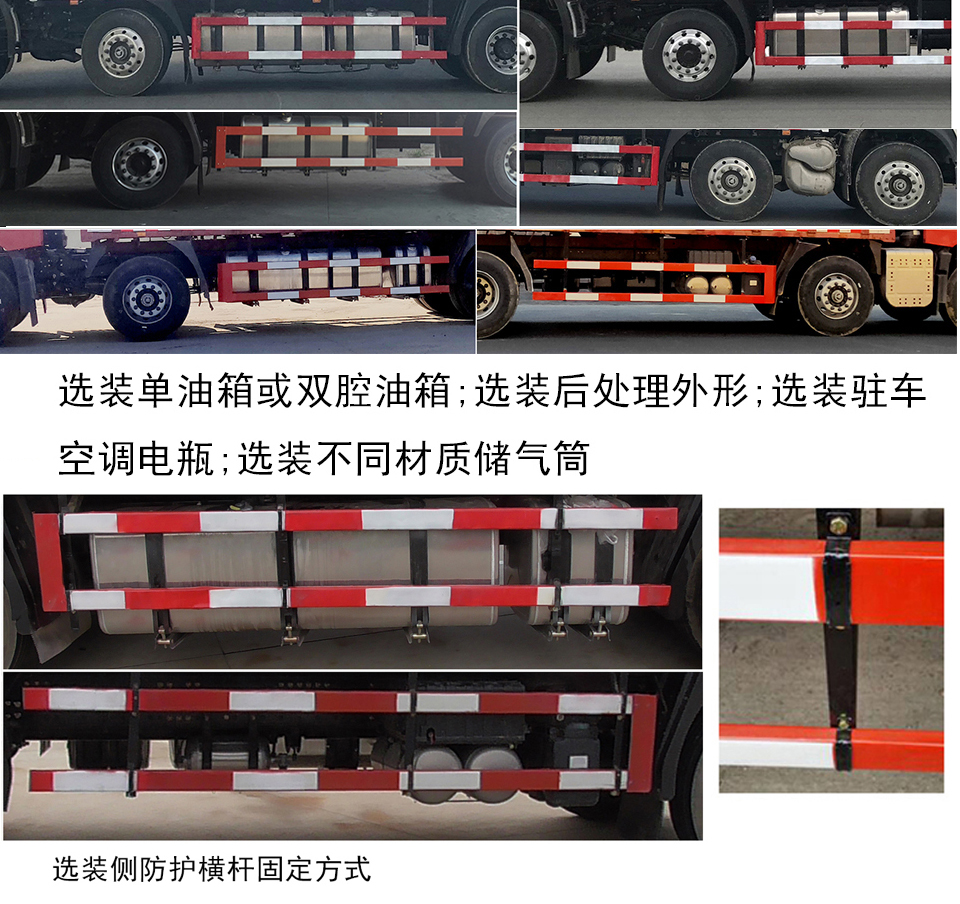 1.发动机DDi11E465-60最大净功率337kW。2.安装具备卫星定位功能的行驶记录仪。3. 驾驶室顶部气喇叭为选装件,选装驾驶室前面罩,选装驾驶室外部图案;AEBS摄像头和雷达面罩为选装件;选装单油箱,双油箱或双腔油箱;选装后处理外形和后处理隔热板;选装驻车空调电瓶;选装不同材质储气筒,选装工具箱位置与样式;选装冲洗水罐;选装上装结构和后门;仓栅顶部到货箱底板的高度为2400mm,2450mm,2500mm,2550mm,2570mm,2600mm,2650mm,2700mm。4.ABS型号/生产企业:ABS 8/东科克诺尔商用车制动系统(十堰)有限公司。5.选装侧防护横杠固定方式,装备侧面及后下部防护装置,侧防护:材质Q235、工程塑料,连接方式螺栓连接.后下防护:材质Q235、DL510,连接方式螺栓连接,断面尺寸120×60mm、120×80mm,离地高度480mm、460mm、440mm。6.选装限速装置,限速89km/h。7.发动机DDi11E465-60对应油耗申报值37.1L/100km。8.该车型可选装ETC车载装置。 |