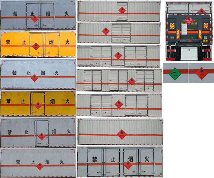 1、该车为危险品货物运输车,危险货物类项号:2.1,2.2.运输易燃气体时挂2.1类警示牌,运输非易燃无毒气体时挂2.2类警示牌,厢体顶部封闭,不可开启。2、侧/后防护材料为Q235,侧防护采用螺栓连接,后防护采用焊接连接,后防护截面尺寸为135×45mm,下边缘离地高460mm;液压尾板时收起状态的水平长度为300mm,尾板质量为550kg。3、整车长/轴距/前悬/后悬对应关系为(mm):11990/1800+5600/1430/3160,10400/1800+4600/1430/2570,安装限速装置,限速80km/h;仅采用排气管前置,前轮盘式制动器,子午线轮胎,后轴空气悬挂的底盘;转向轮安装轮胎爆胎应急防护装置,该车安装带有卫星定位功能的行驶记录仪;可选装ETC车载装置;EBS系统控制器生产企业/型号为威伯科(上海)管理有限公司/EBS3;发动机/油耗值(L/100Km)对应关系为:MC07.25-60/29.42,MC07.31-60/29.42。4、随底盘选装驾驶室,选装侧开门,侧门单开门、侧门双开门、侧门不开门,选装侧门型式及位置,选装车辆后部结构。 |