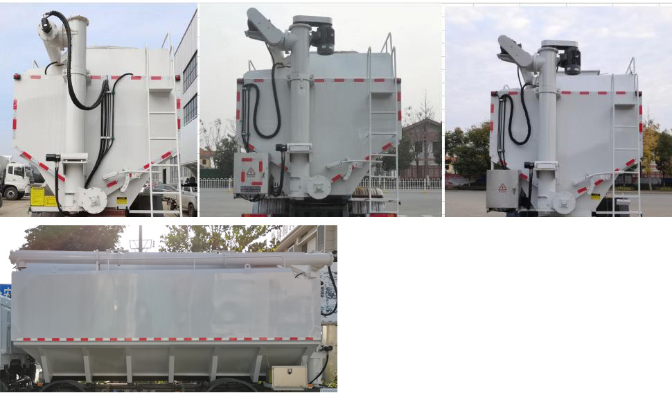 浩天星运牌东风天锦小三轴26方散装饲料运输车外型特点突出,底盘配置优越,整车的在上料,卸料过程中使用到的三个蛟龙都有自己的独到之处,三个蛟龙在工作过程中,活动蛟龙最大回转角度为180度,最大仰角为60度,同时水平输送最大距离为7.2m,垂直输送最大距离为8.2m,卸料操作的残留率为0.01.