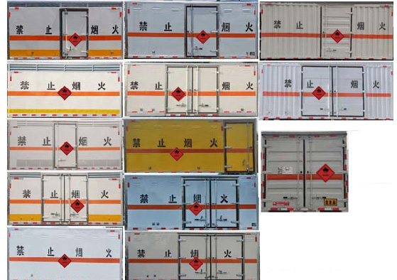 备注 | 该车用于危险品运输,厢体顶部封闭,不可开启.该车主要用于运输具有独立容器(瓶)包装的易燃液体,类项号:2.1,2.2;该车仅装子午线轮胎;转向轮安装爆胎应急防护装置,排气管前置,装配前轮盘式制动器,装配限速装置,限速80km/h,装配具有卫星定位功能的行驶记录仪;ABS系统型号为XH-KQ4S4M-E01,生产企业为广州市西合汽车电子装备有限公司;型号为CM4XL-4S/4M,生产企业为广州瑞立科密汽车电子股份有限公司;型号为VIE ABS-Ⅱ,生产企业为浙江万安科技股份有限公司.发动机/油耗申报值(L/100km)对应关系为:F3.8NS6B190/11.38,F2.8NS6B156/11.40,NV30-C6B/11.38,WP2.3NQ130E61/10.18,D25TCIF1/11.06,WP4.1NQ190E61/11.41,D40TCIF1/11.39,CY4SK661/11.34,D30TCIF1/11.34,WP3NQ150E61/10.48,WP3NQ160E61/10.48,侧、后防护材料材质均为Q235,均为螺栓连接;后部防护装置的截面尺寸100×50mm,后防护离地高度为450mm.该车型可选装直接供电式ETC车载装置.随底盘选装驾驶室,选装前面罩,厢体侧面选装开门型式及位置,选装不带侧开门,选装厢板结构.仅采用底盘3280mm轴距改装. |