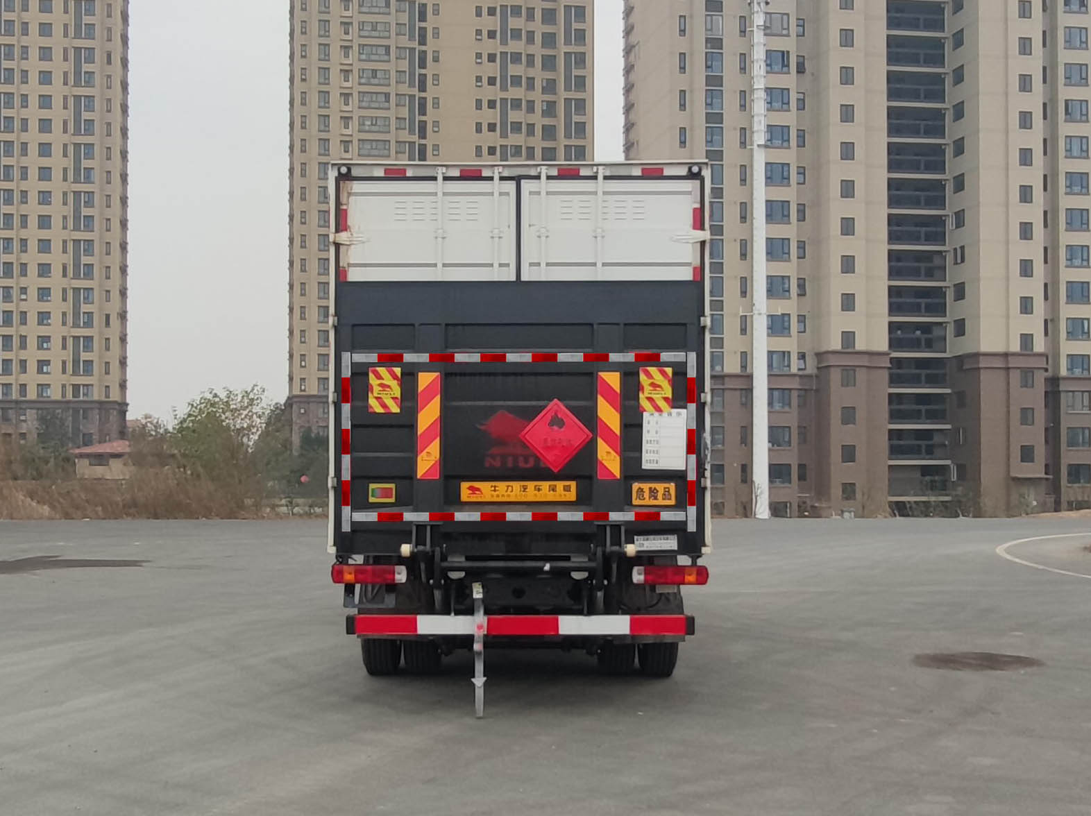 厢体顶部封闭,不可开启;随底盘选装高顶驾驶室,选装侧开门,侧门可为单开门或双开门或三开门或不开门,选装侧门型式及位置,选装双门杆,选装平面和瓦楞板结构,选装货厢两侧开门;起重尾板收起状态水平长度为290mm,尾板质量为550kg(不计整备质量之内);该车为危险货物运输车,运输具有独立容器包装的易燃气体,类项号为2.1;运输具有独立容器(瓶)包装的非易燃无毒气体,类项号为2.2;仅采用前轮盘式制动器,前置排气管,子午线轮胎,限速装置的底盘,限速79km/h;后轴为空气悬架;转向轮安装爆胎应急防护装置;油耗申报值(L/100Km)与发动机对应关系:22.0(CA4DK1-22E61/CA4DK1-18E61/CA4DK1A18E61),23.9(CA6DH1-24E61);该车安装具有卫星定位功能的行驶记录仪;EBS系统生产厂家,型号 :威伯科汽车控制系统(中国)有限公司,:EBS3;侧面防护及后下部防护装置材料材质:Q235,连接方式:侧防护焊接,后防护焊接加螺栓连接;后下部防护装置断面尺寸(宽×高):60×120(mm),离地高度:470mm.可选装不带液压尾板,不带液压尾板状态后下部防护装置断面尺寸(宽×高):60×120(mm),离地高度:490mm,连接方式:焊接加螺栓连接;可选装ETC车载装置. |