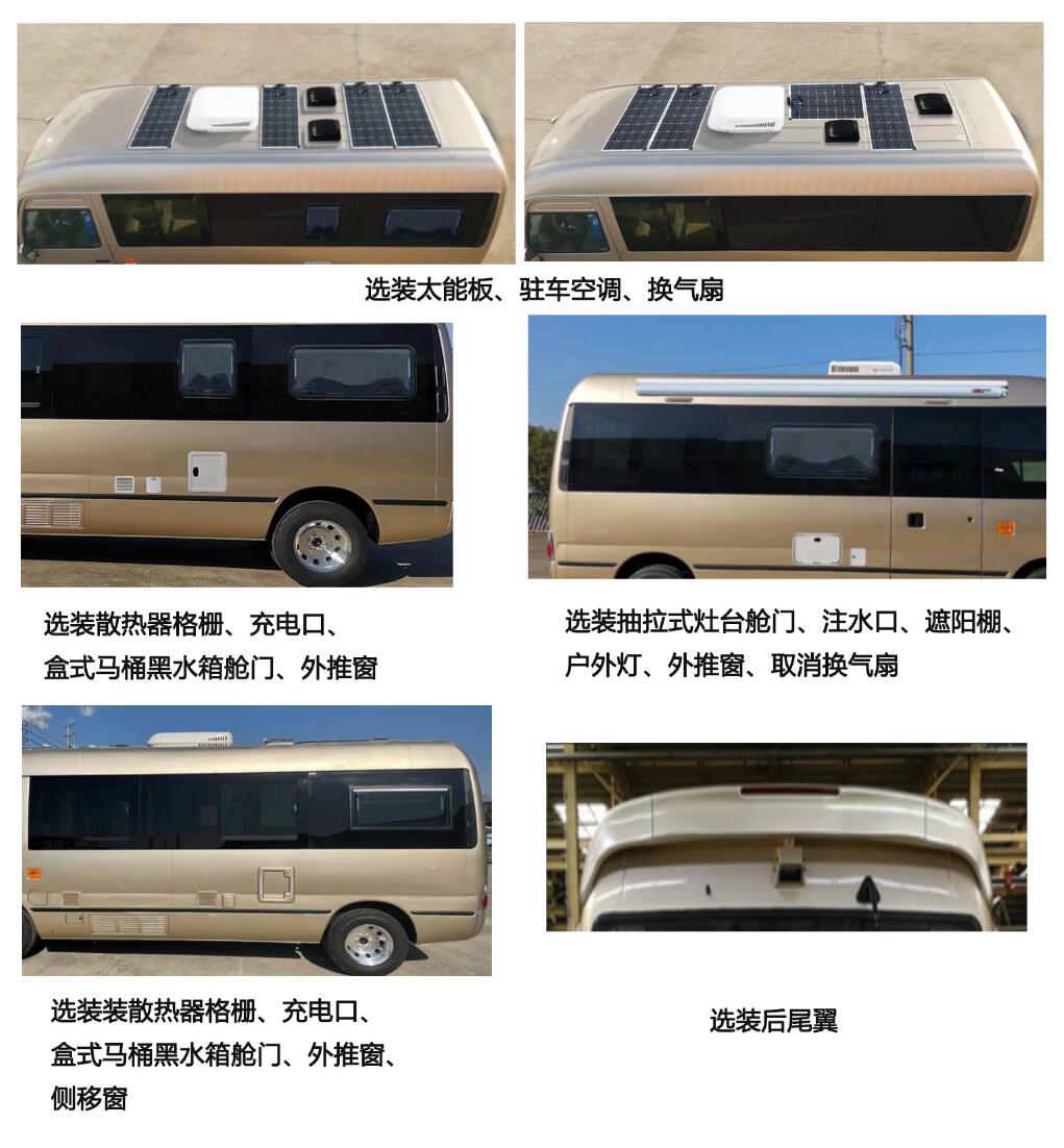 1.ABS型号/生产企业:ESC/武汉元丰汽车电控系统有限公司.2.4GA1-2发动机净功率为130kW,3.该车悬架型式为前扭杆弹簧独立悬挂,后钢板弹簧非独立悬架.4.该车型可选装ETC车载装置,5.配备厨具,卧具,卫生设施等旅居生活设施和娱乐设施等专用装置.6.该车选装抽拉式灶台舱门,注水口,遮阳棚,太阳能板,驻车空调,换气扇,盒式马桶黑水箱舱门,充电口,散热器格栅,外推窗,户外灯,后尾翼,侧移窗,换气扇,遮阳棚,舱门.取消顶置空调时高度2770mm;选装顶置空调或顶置排气扇或驻车空调时车高为2880mm. |