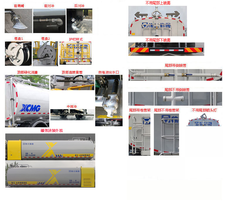 该车主要专用装置为水罐、水路及作业装置,用于路面环境清洗清洁作业.前伸尺寸940mm.罐体总容量:13.6立方米,罐体外形尺寸(长轴×短轴×长度)(mm):2420×1540×5100,介质为水;罐体有效容积13立方米.选选装鸭嘴、对冲、卷盘、护栏样式、顶部绿化浇灌、中排冲、直喷雾管、自吸进出水口、罐体涂装外观、不带尾部上下喷雾、直喷管、卷管架、不带尾部箭头灯,该系列选装对于整车尺寸、重量变化可忽略不计;侧防护与后防护装置材质均为Q355B,连接方式均为螺栓连接;后防护装置的断面尺寸为180×60mm,离地高度为450mm.ABS控制器型号/生产厂家:VIE ABS-II/浙江万安科技股份有限公司. |