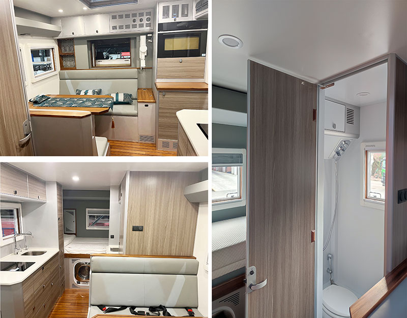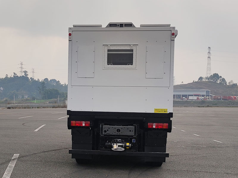 发动机最大净功率199kW;侧防护为裙板结构,材质为6061铝合金,后防护材质为Q355,截面尺寸:100X40(高X宽,单位:mm),离地高度为:350(mm),连接方式为:螺栓连接;ABS系统控制方式:单参数控制(4S/4M);ABS系统控制器型号:4460046300;ABS系统控制器生产企业:威伯科(上海)管理有限公司;车厢内部配备桌椅、床、厨具、马桶、淋浴等生活设施;车厢后顶部中间灯具仅限人员在野外非道路状况下工作和生活照明使用;可选装ETC车载装置。 |