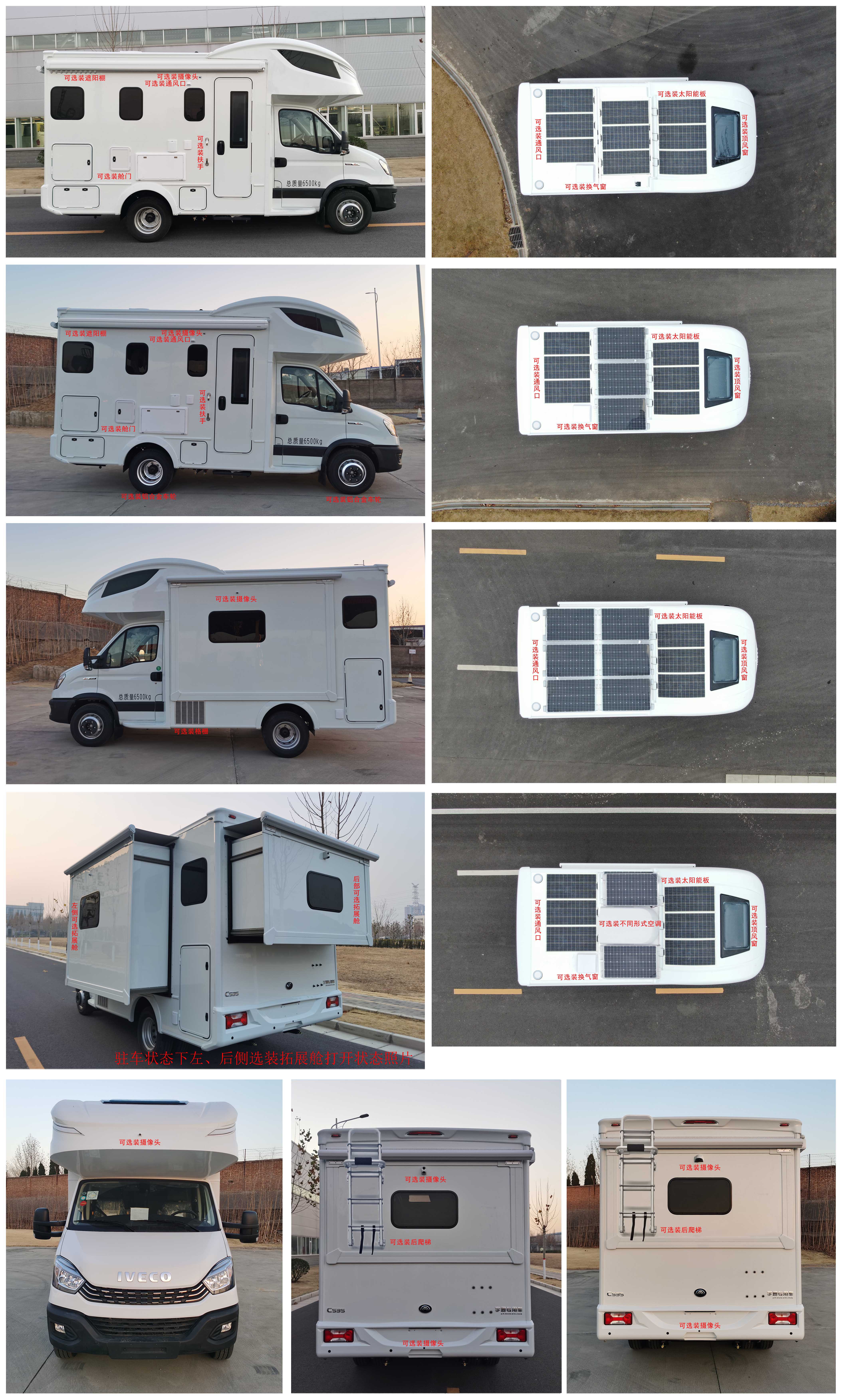 1.该车配备卧具、厨具、卫生设施等旅居生活设施,用于旅行宿营;2.ABS系统控制器型号:ESP9,ABS系统控制器生产企业:博世汽车部件(苏州)有限公司;3.选装高配时对应整备质量为5000kg,选装中配时对应整备质量为4800kg或4550kg,选装简配时对应整备质量为4350kg;4.车身两侧均选装遮阳棚时对应整车宽度为2530mm,单侧选装遮阳棚时对应整车宽度为2430mm;选装不同形式空调时整车高度为3240mm或3199mm;5.车辆左侧可选装摄像头及格栅,车辆右侧可选装通风口、扶手、摄像头及遮阳棚、舱门,车身后部可选装后爬梯及不同型式摄像头,车身前部可选装摄像头,车辆顶部可选装换气窗、顶风窗、太阳能板、空调、通风口;该车可选装铝合金车轮;6.车内可选装不同型式橱柜;7.该车以裙边结构作为侧、后防护,侧防护下边缘离地高度470mm,后防护下边缘离地高度490mm;8.发动机净功率值:123kW(F1CE8481K);9.该车可选装ETC车载装置.10.车辆左侧可选装仅在驻车状态下使用的拓展舱,车辆后部可选装仅在驻车状态下使用的拓展舱; |