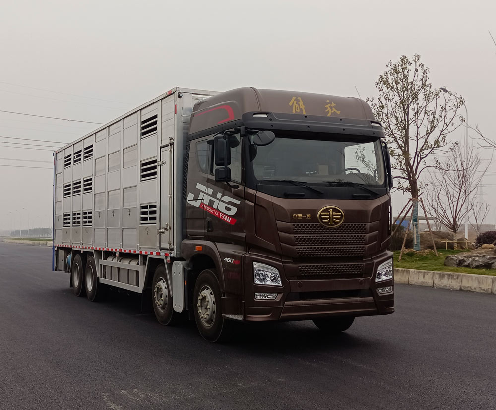 畜禽运输车又被叫做运猪车、拉猪车、鸡苗运输车,是一种主要用来运输活禽类的专用车型,有仓栅式和厢式两种结构形式,前一种结构比较简单,适合短途运输,而后一种配置上比较高端,适合活禽的长途运输,能够最大程度的保证活禽成活率,提高运输效率,那接下来就给大家介绍一款优质的畜禽车,即同锐通牌解放JH6前四后八国六铝合金畜禽运输车畜禽运输车,这款畜禽运输车有着怎样的配置呢?