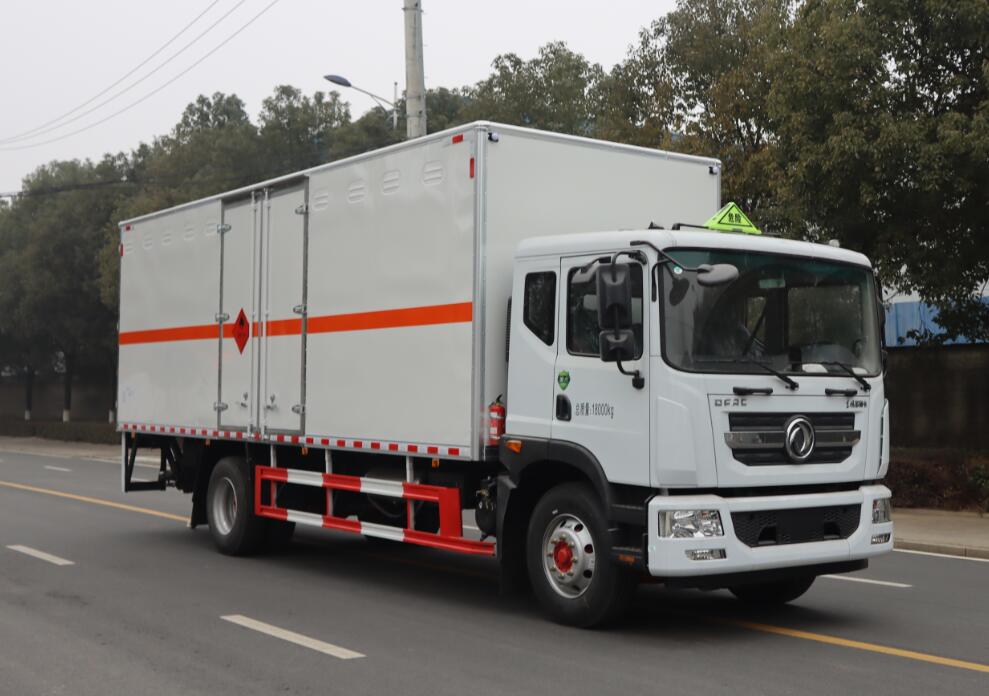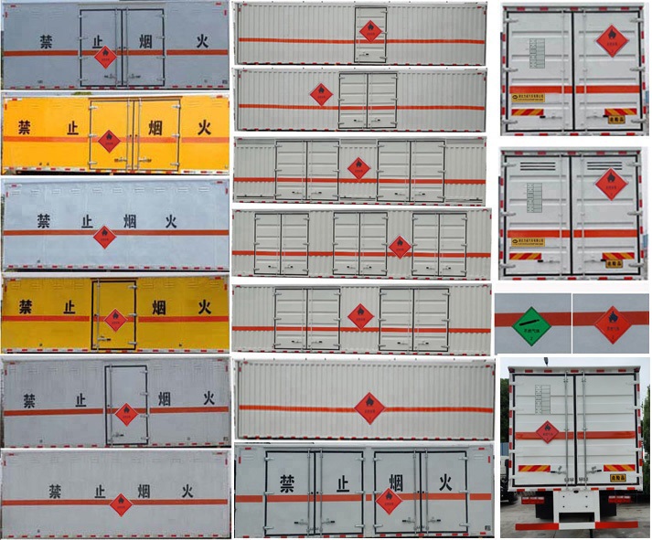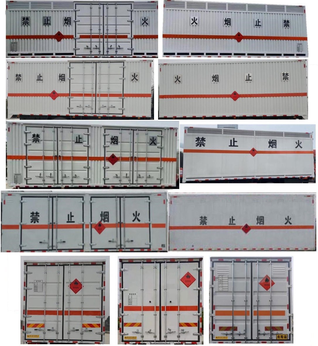 该车为危险品货物运输车,该车运输独立容器(瓶)包装的货物,危险物品类项号:2.1,2.2,运输易燃气体时挂2.1类警示牌,运输非易燃无毒气体时挂2.2类警示牌;厢体顶部封闭,不可开启;整车长(mm)/轴距(mm)/后悬(mm)对应关系分别为:10320/5600/3460,9995/5600/3135,9250/5300/2690,8650/4700/2690;尾板收起状态水平长度为290mm,尾板质量为:550kg;侧、后防护装置材料材质:Q235,侧防护采用螺栓连接,后防护采用焊接连接,后防护装置断面尺寸为(mm):50×120,后部防护离地高度:480mm;选装后部不带尾板时,后防护装置材料:Q235,后防护采用焊接连接,后防护装置断面尺寸为(mm):50×120,后部防护离地高度:480mm;转向轮安装轮胎防爆应急防护装置,安装子午线轮胎,前轮盘式制动器,排气管前置,安装具有卫星定位功能的行驶记录仪,安装限速装置,限速80km/h;后轴为空气悬架结构;EBS系统生产厂家,型号:襄阳东风隆诚机械有限责任公司,EBS/ESC-d;发动机型号及油耗值(L/100km)为:B6.2NS6B230(26.7),D4.5NS6B220(26.6),YCS04200-68(26.4),CY4SK761(26.8);该车型可选装直接供电ETC车载装置.随底盘选装驾驶室,选装侧开门,侧门单开门、侧门双开门、侧门不开门,选装侧门型式及位置,选装复合板,选装后门样式. |