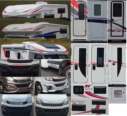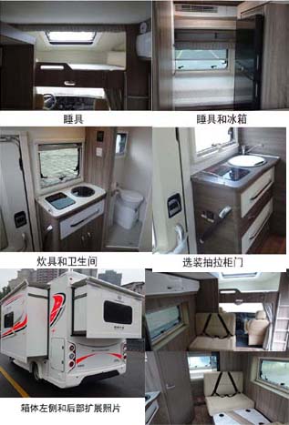 ABS型号:BOSCH ABS9、BOSCH ESP9;ABS生产企业:BOSCH公司;发动机净功率值:F1AE8481D发动机最大净功率93KW;F1CE8481K发动机最大净功率123kW;选装部件名称及其相关描述:选装侧面无遮阳棚车宽2455mm;高配车整备质量4050kg,中配车整备质量3980kg,低配车整备质量3850kg;选装不同形式空调,高度为3310mm或3180mm或3130mm或3080;选装小额头车顶造型,选装前门无上车踏步,前下部裙边包围,选装乘客门及把手样式,空调百叶窗,选装侧面、后部不同窗户和舱门样式及位置,选装后部不同尾翼;随底盘选装前雾灯,红色格栅和镀铬格栅;选装ETC.;所用材料材质、连接方式以及后部防护装置的主要尺寸参数(断面尺寸和离地高度):侧面防护为客厢式裙边结构,离地高290mm;后防护为原车自带防护装置,位于后裙边包围内部,材料Q235,槽形,螺栓连接,断面尺寸220mm×90mm,离地高380mm;车厢顶部封闭且不可开启;专用功能及装置描述:主要专用装置睡具,炊具,冰箱,卫生间等;其他说明:该车左侧和后部部分箱体在车钥匙未通电状态时能向外扩展,当车钥匙通电后则限制扩展; |