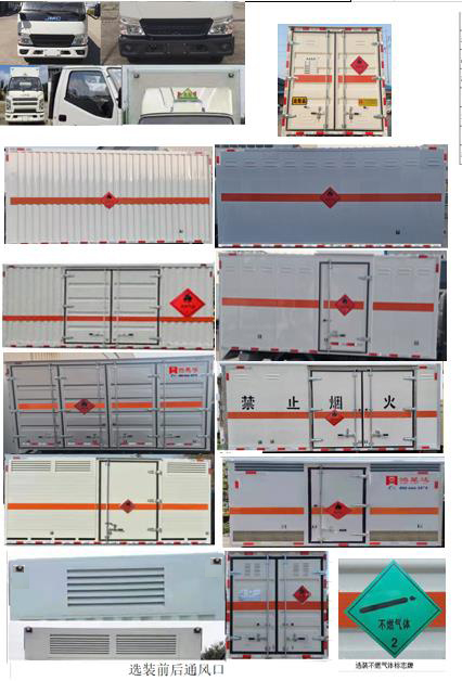 随底盘选装不同风格中网、侧窗、前部灯具及前保险杠.选装导流罩;发动机/油耗申报值(L/100km)JX493ZLQ6D/10.75;安装有限速装置,限速装置限速80km/h.安装有具有卫星定位功能的行驶记录仪.装子午线轮胎,转向轮安装爆胎应急防护装置,排气管前置,装配前轮盘式制动器.该车为危险品货物运输车运输具有独立容器包装的易燃气体,运送危险品类项号为2.1,运输具有独立容器包装的非易燃无毒气体,运送危险品类项号为2.2;车厢顶部封闭,不可开启.选装货箱样式;瓦楞板样式;侧开门样式;不开门样式;后开门样式;前后通风口样式;选装不燃气体标志牌;侧面防护及后下部防护装置材料材质:Q235,侧面防护连接方式:焊接连接;后下部防护装置连接方式:螺栓连接,断面尺寸(宽×高):50×100(mm),离地高度:420mm.ABS系统型号:APG3550500A,ABS系统生产厂家:浙江亚太机电股份有限公司;ABS系统型号:3550B500,ABS系统生产厂家:浙江亚太机电股份有限公司;ABS系统型号:VIE ABS-II,ABS系统生产厂家:浙江万安科技股份有限公司;选装ETC车载装置.整备质量含备胎,灭火器及随车工具;货箱重量860kg;货箱底板材质Q235花纹板,厚度2.5mm;边板材质DC01,厚度1.5mm |