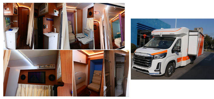 该车型驾驶室与车厢采用中隔墙分隔,车厢内分为公共区和母婴休息区,在公共区选配置空调、卫生间、消毒柜、等设备,为母婴提供清洁、消毒、加热、卫生等生活服务;在母婴休息区,用隔帘隔出三个独立空间,每个空间配置有沙发、婴儿护理台等设施,为母婴休息、婴儿护理等生活需求提供服务;整车设有消毒系统、照明系统、烟雾报警器等设施,为 人员活动提供方便、卫生、安全、宽大的空间;该车辆主要用于到达固定或非固定母婴活动场所,为母婴提供人性化服务的车辆。该车侧防护以及后部防护均为裙边结构,侧防护离地高度为(mm):300,后防护离地高度为(mm):280。ABS型号:ABS 9,ESP9.ABS生产企业:博世汽车部件(苏州)有限公司,.该车装配手动变速器时最高车速为145km/h。非行驶状态下车厢可拓展。该车可选装ETC车载装置。选装前格栅、前雾灯、全钢板不带玻璃后围、带玻璃后围、LED灯、日间行车灯、轮圈、轮饰盖,消音器,后围开口,后视镜,车身同色外饰板、360摄像头。 |