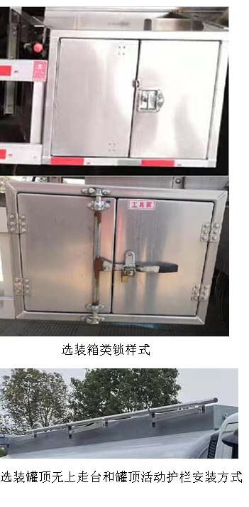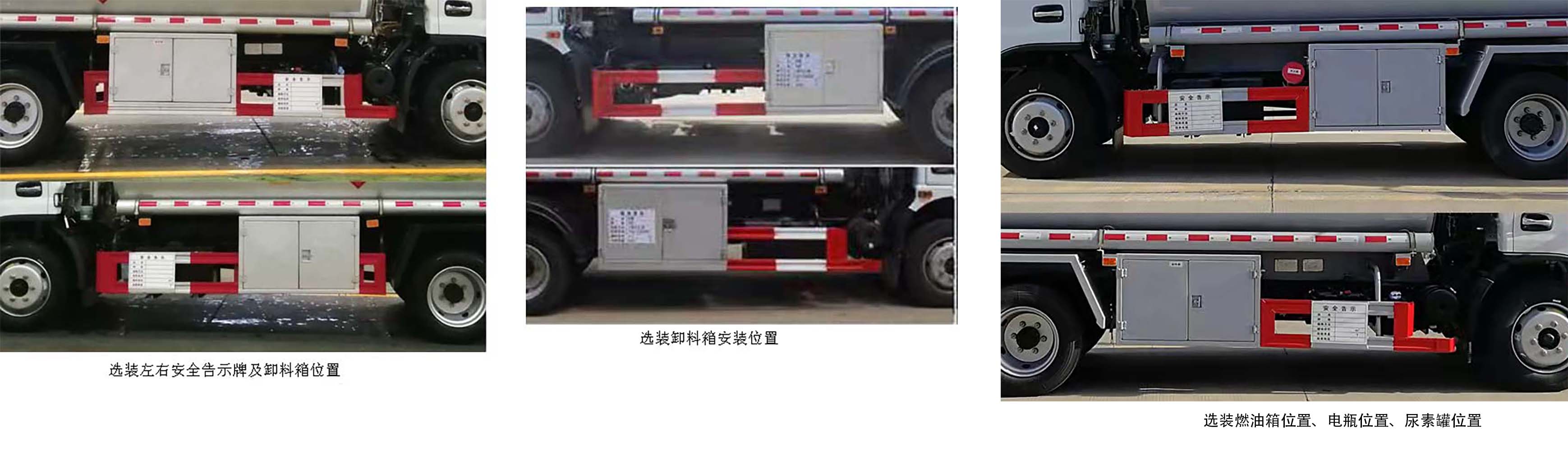 1、该车适用于危险品运输,运送危险货物车辆类型为:FL型,准运介质最大密度:830千克/立方米, 罐体总容量8.1立方米,罐体有效容积7.7立方米,罐体外形尺寸(长×宽×高)(mm):4500×1980×1230。仅采用3800mm轴距。2、侧防护材料采用Q355B,与车辆中部连接梁螺栓连接;后防护材料采用Q355B,与车辆车架后端螺栓连接,后防护材料截面(mm)120×60,下边缘离地高450mm。3、加油机型号及生产企业:BL1111Z/珠海市贝林加油设备有限公司中山分公司,HS1812B/托肯恒山科技(广州)有限公司,SKES-1112/恒和嘉华科技有限公司(上海伯莱机械有限公司),SK20QF-111A、SK20QF-222A/郑州三金石油设备制造有限公司,CS20D1110F/正星科技有限公司,JSK-70B1121CZ,JSK-70B1121C,JSK45B1121C/稳恩佳力佳(北京)石油化工设备有限公司, ZH6444/佛山市众泽机电科技有限公司, XTST121BF1/邢台正润通科技发展有限公司,TA-1111KFJ/沈阳航天新阳机电有限公司。4、随底盘选装前面罩,前保险杠,前组合灯具,前雾灯。仅选用排气管前置、限速装置(限速80km/h)、前轮盘式制动及子午线轮胎的底盘,转向轮安装轮胎防爆应急防护装置。安装带有卫星定位功能的行驶记录仪。ABS型号/厂家:ABS/ASR-24V-4S/4M/襄阳东风隆诚机械有限责任公司。5、选装ETC装置;选装左右安全告示牌位置;选装燃油箱位置、电瓶位置、尿素罐位置;罐体上部选装无上走道;选装罐顶活动护栏样式;选装箱类锁样式和卸料箱安装位置。 |