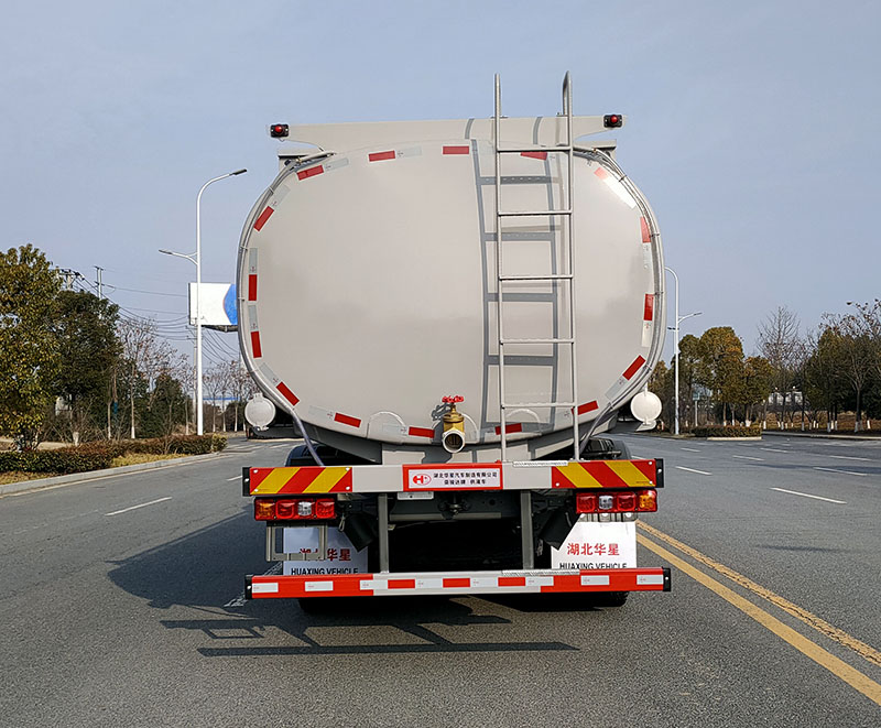 车身四周贴有反光标贴,充分保障行车安全,在罐体上还喷有易燃液体/气体的危险警示标志,警示过往车辆注意避让。