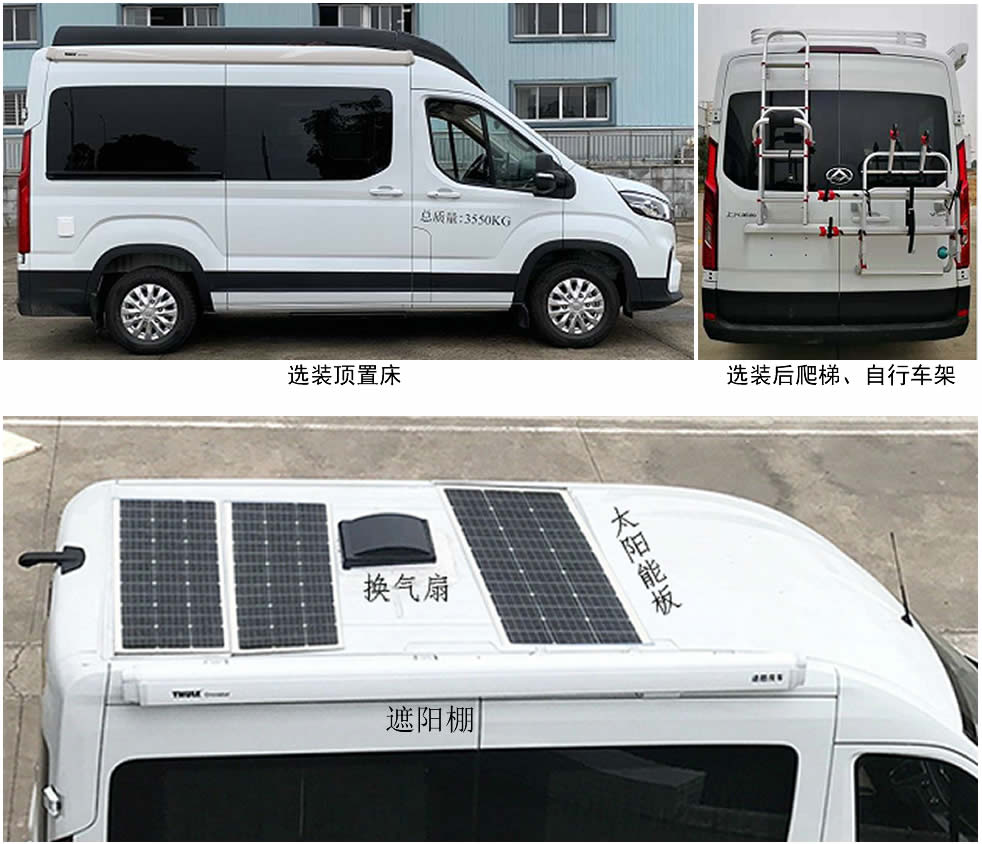 车辆配备卧具、厨具、遮阳棚、卫生设施等生活和娱乐专用装置.选装ETC.选装自行车架及后爬梯时,车长5996mm, 前/后悬:1020/1610mm;不选装时,车长5546mm.选装换气扇,车高2682mm;选装顶置床时,车高2780mm,准备质量为3020kg;车顶不选装设备或太阳能板,车高2535mm.侧防护和后防护由车身侧围板和后围板代替,侧防护下边缘离地高度350mm,后防护下边缘离地高度368mm.ABS型号:ABS 9,ESP9,ABS生产企业:博世汽车部件(苏州)有限公司,博世汽车部件(苏州)有限公司. |