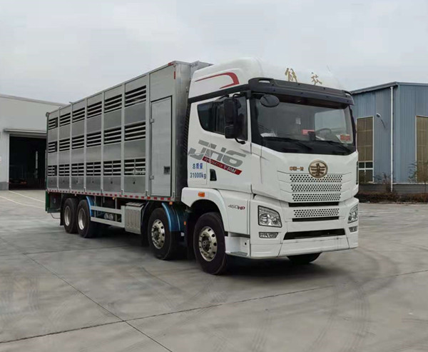 畜禽运输车又被叫做运猪车、拉猪车、鸡苗运输车,是一种主要用来运输活禽类的专用车型,有仓栅式和厢式两种结构形式,前一种结构比较简单,适合短途运输,而后一种配置上比较高端,适合活禽的长途运输,能够最大程度的保证活禽成活率,提高运输效率,那接下来就给大家介绍一款优质的畜禽车,即天润新东牌解放JH6前四后八国六铝合金畜禽运输车畜禽运输车,这款畜禽运输车有着怎样的配置呢?