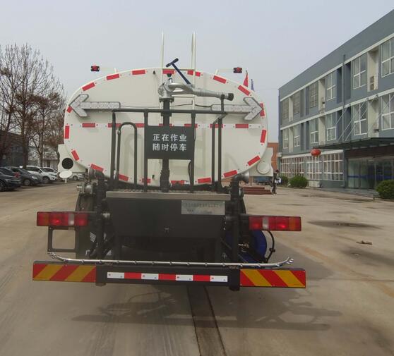 车身喷漆采用白蓝相配,寓意蓝天白云,保卫环境整洁的意思;整车外形尺寸为9360×2530×3120(mm),罐体容量大,车辆额定载质量达到9295(Kg),保证了运输的水容量,改装配置上,加装有60米的耐高压钢丝清洗高压管,方便近距离作业;配上金属喷漆,提高车辆档次,确保罐体无掉漆,延长使用寿命,同时整车造型美观,比例协调。
