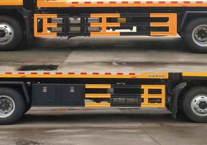 该车主要用于道路清障,主要专用装置为平板、托臂、绞盘、钢丝绳、油缸。整备质量(kg) /托举质量(kg)对应关系为:10500/7305,11300/6505。仅采用轴距5000,5800mm。侧防护材料为Q235,螺栓连接,后防护由专用装置代替,下边缘离地高500mm。ABS控制器型号/厂家:CM4XL-4S/4M/广州瑞立科密汽车电子股份有限公司。选装限速装置时最高车速为89km/h。选装不同样式的前围面板和格栅。选装平板样式,选装尾部样式,选装绞盘安装位置。选装侧防护样式。选装尾部灯具样式,选装后托臂样式,选装平板边框样式。 |
