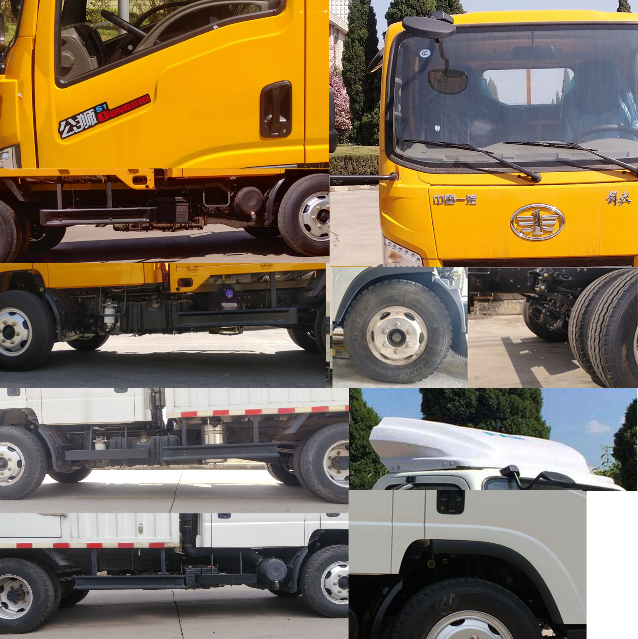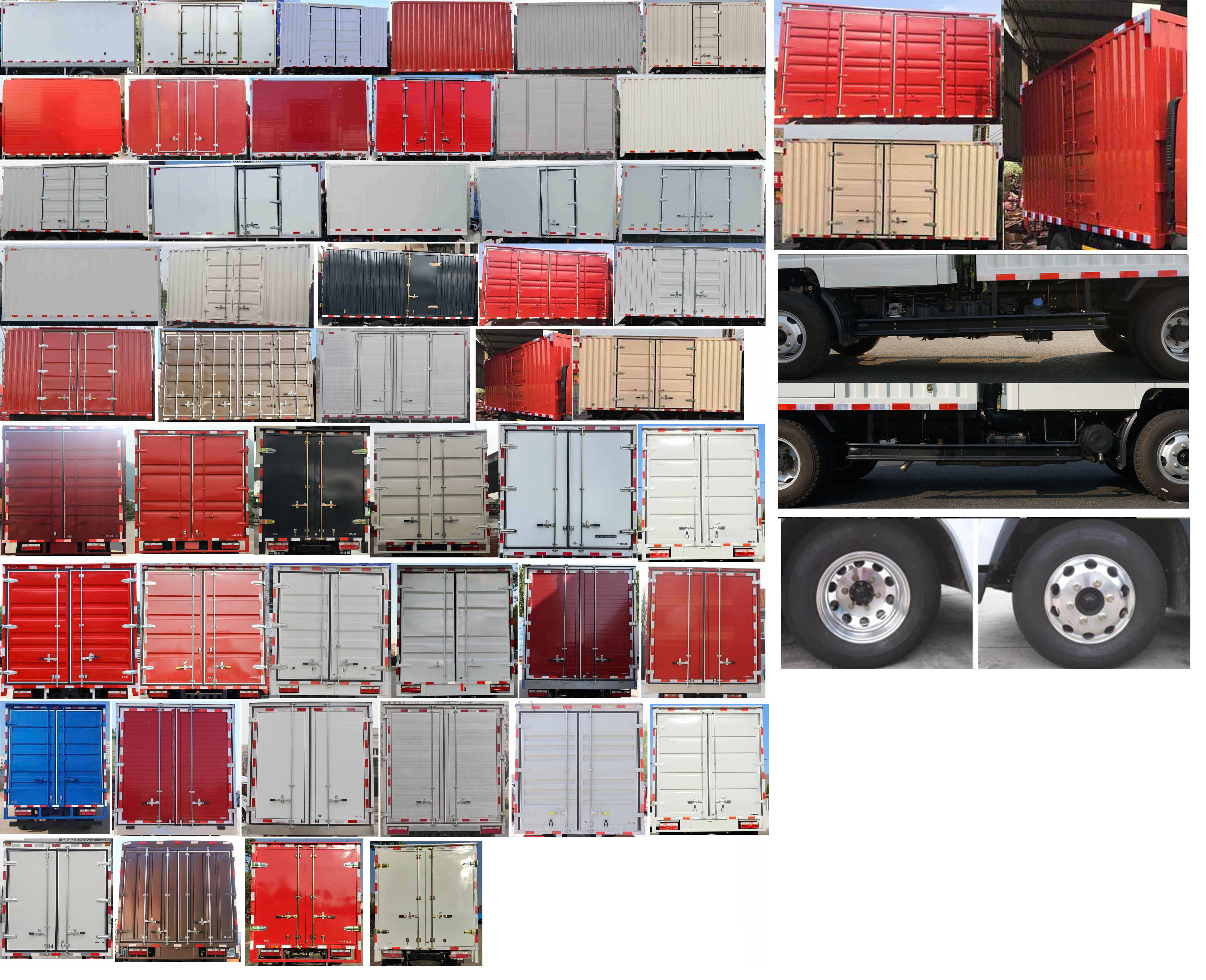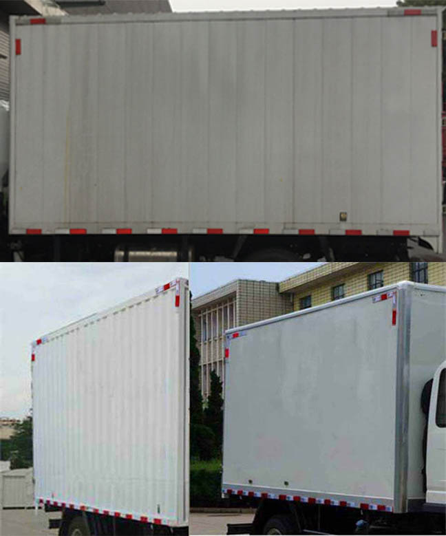 顶部封闭,不可开启,CA4DB1-11E6、CA4DB1-13E6、D25TCIF1发动机油耗值分别为10.2、10.2、11(L/100km) 防护装置材料Q235A,螺栓连接, 后部防护装置断面尺寸100×50mm,离地高度490mm.安装ABS型号为CM4XL-4S/4M,生产厂家为广州瑞立科密汽车电子股份有限公司.选装货厢外观, 选装导流罩.选装无备胎,选装铝合金材质货箱,选装铝合金轮辋.整备质量对应的配件包括备胎(装配备胎时包含在整备质量中)、随车工具.货箱重量为585kg.货箱底板材质为:Q335花纹钢板、铝合金,货箱底板板材厚度为2.0mm,货箱前板、后门、侧板、侧门、顶盖板材质为:08F、铝合金,材料厚度为1.0mm,顶盖材料厚度为0.8mm. |