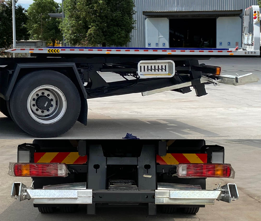 该车主要用于道路清障,主要专用装置为平板、托臂、绞盘、钢丝绳、油缸、吊机。准乘人数/整备质量(kg)/托举质量(kg):2人/15500/2370,2人/14500/3370,3人/15500/2305,3人/14500/3305。侧防护材料为Q235,螺栓连接;后防护由专用装置代替,下缘离地高470mm。ABS型号/生产厂家:VIE ABS-II/浙江万安科技股份有限公司。仅选用5700mm轴距。随底盘选装驾驶室,选装不同平板样式,选装尾部样式。选装绞盘安装位置。 |