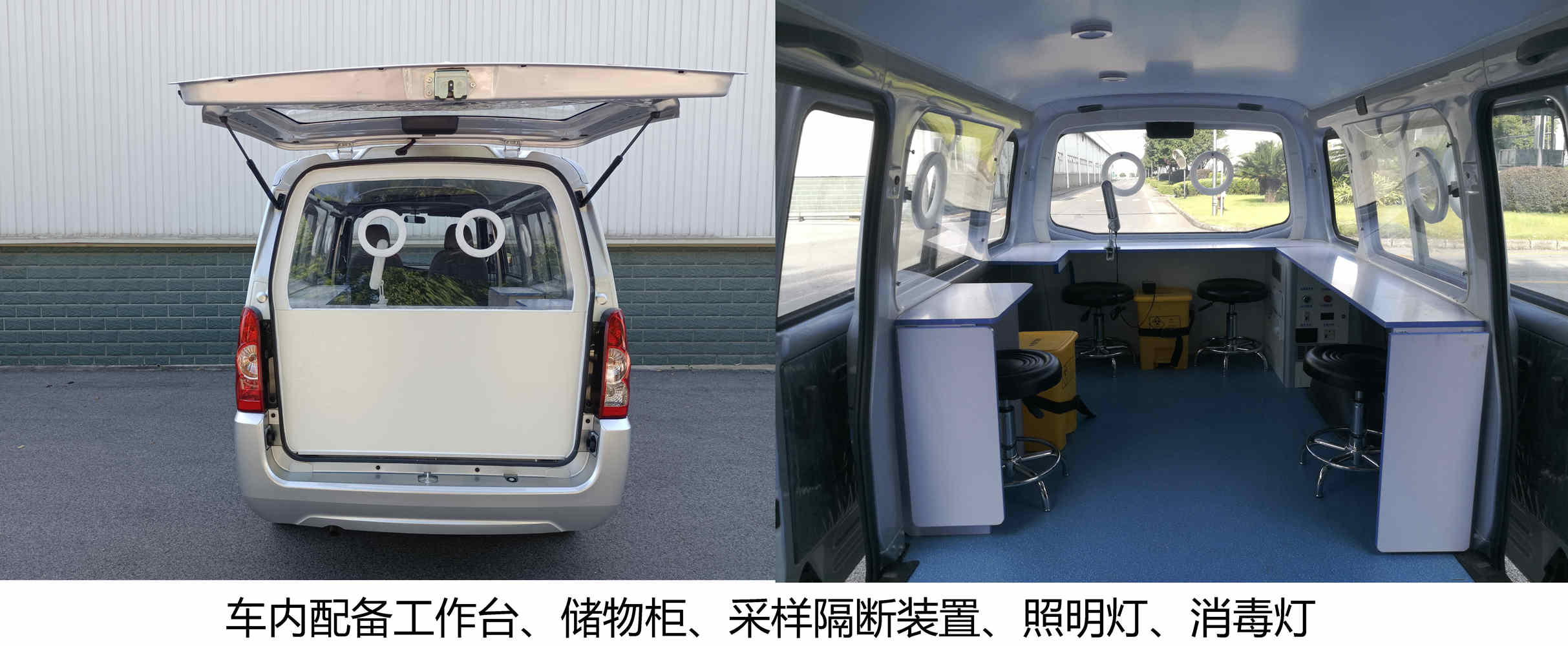 发动机最大净功率值为72kW.ABS型号/生产企业:ABS9/博世汽车部件(苏州)有限公司,ABS9/博世汽车部件(成都)有限公司,RedABS5/联创汽车电子有限公司.该车型可选装ETC车载装置.该车配备汽车事件数据记录系统(EDR).车内配备工作台、储物柜、采样隔断装置、照明灯、消毒灯专用设备,用于病毒采样流动服务作业. |