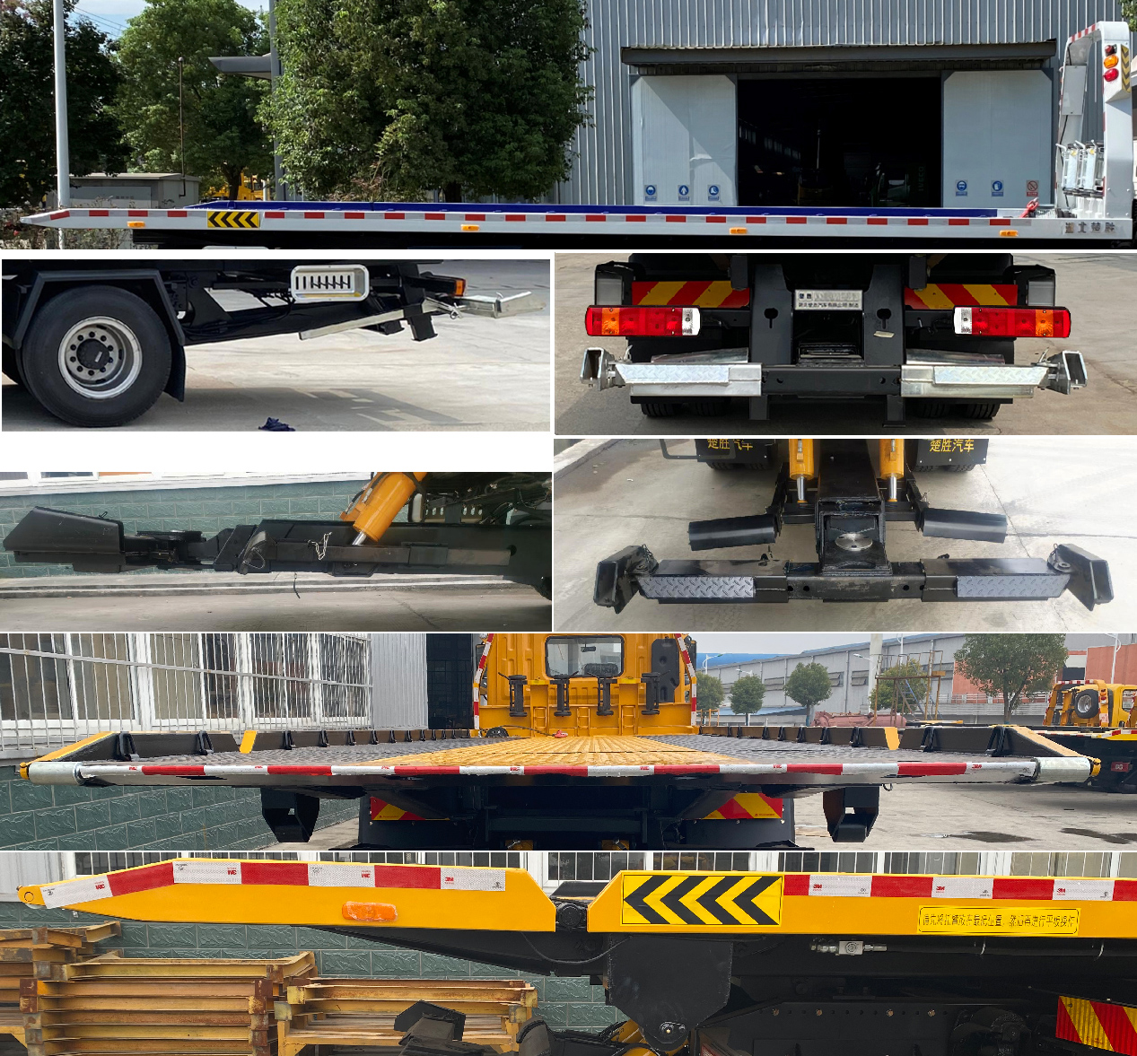 该车主要用于道路清障,主要专用装置为平板、托臂、绞盘、钢丝绳、油缸、吊机。准乘人数/整备质量(kg)/托举质量(kg):2人/15000/2870,2人/14000/3870,3人/15000/2805,3人/14000/3805。侧防护材料为Q235,螺栓连接,后防护由专用装置代替,下缘离地高500mm。ABS系统型号/生产厂家:CM4XL/长春瑞立科密汽车电子有限公司。仅采用轴距5800mm。随底盘选装驾驶室,选装不同平板样式,选装尾部样式。选装绞盘安装位置。选装支撑滚轮。 |