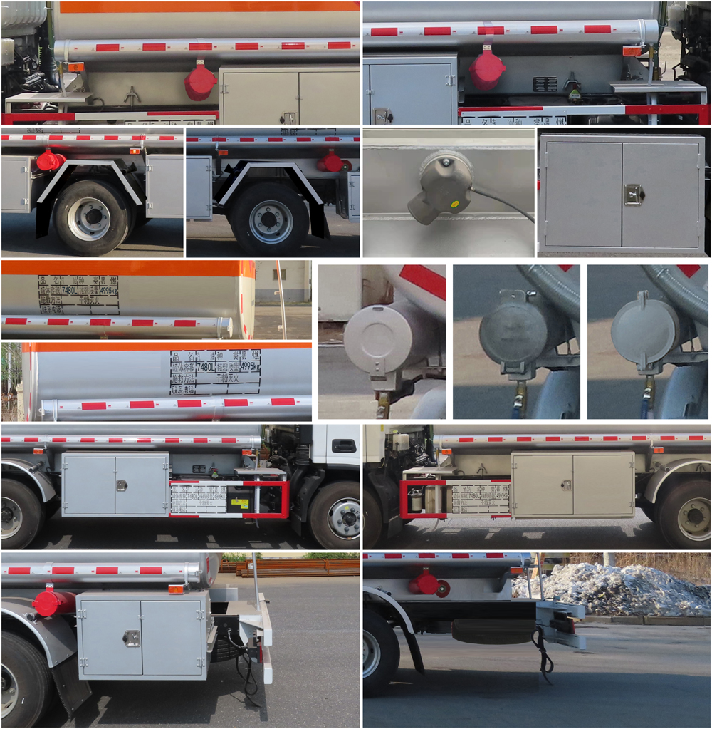 罐体尺寸:罐长4.65米,长轴1.725米,短轴1.165米.总容量7.48立方米,有效容积7.13立方米.侧后防护材质均为Q235,螺栓连接.后防护截面尺寸为120x60(高x宽)毫米,下平面距地高为430毫米.该车排气管前置,装配前轮盘式制动器,随底盘装配限速装置,限速80km/h.ABS系统型号:ABS-VI.E;生产企业:广州瑞立科密汽车电子股份有限公司.ABS系统型号:ABS-E;生产企业:威伯科汽车控制系统(中国)有限公司.安装具有卫星定位功能的行驶记录仪.危险货物运输车辆的车辆类型FL.该车型为危险货物运输车辆,准运介质密度最大值0.7吨/立方米.加油机型号/厂家:JSK-70B1121CZ/稳恩佳力佳(北京)石油化工设备有限公司,CS20D1110F/正星科技有限公司,BL1111Z/珠海市贝林加油设备有限公司.仅选用底盘子午线轮胎.转向轮装备轮胎爆胎应急防护装置.该车可选装车载ETC装置.随底盘选装驾驶室.选装:灭火器筒安装位置、挡泥板样式、罐顶通气阀、箱门铰链样式、安全告示栏、软管筒后端盖样式、左右两侧中部长箱子、左侧后悬处长箱子安装状态. |