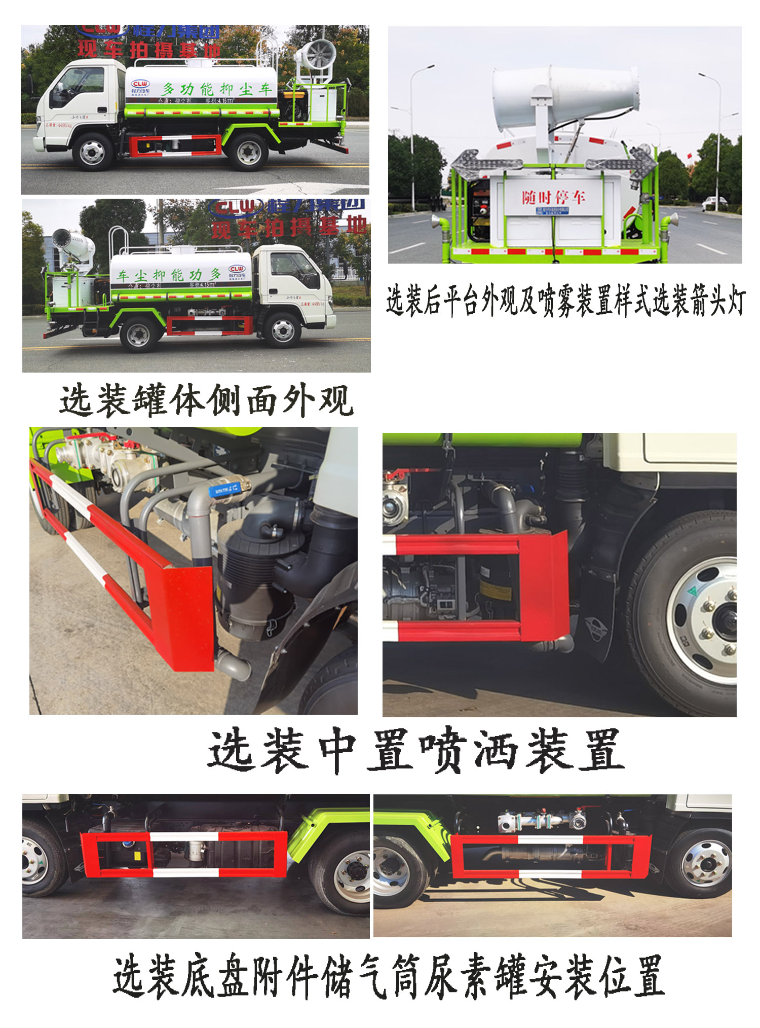 1、仅采用2850mm轴距的底盘。2、该车主要用途为抑尘、降霾、除尘,主要装置为罐体、水泵、喷雾装置; 罐体有效容积:4.15立方米,罐体外形尺寸(长×宽×高)(mm)为:2800×1650×1150;3、侧、后防护防护材料均采用Q235材质,螺栓连接;后防护截面尺寸(高×宽)(mm):100×50,下边缘离地高350mm;4、随底盘选装选装新前格栅及新logo.选装新前围;选装罐体侧面外观,选装后部平台及喷雾装置样式,选装箭头灯,选装中置喷洒装置,选装底盘附件储气筒尿素罐安装位置;5、ABS系统控制方式为4S/4M,气刹:ABS型号为CM4XL-4S/4M,生产厂家为广州瑞立科密汽车电子股份有限公司.液刹:ABS型号为CM4YL,生产厂家为广州瑞立科密汽车电子股份有限公司。 |