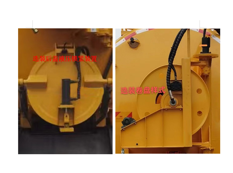 选装驾驶室。该车用途为清洗吸污。主要专用装置为真空泵和罐体.罐体外形尺寸含封头为(长×直径)(mm):6440×2100,其中罐体前段为清水罐含封头(长2870mm);后段为污水罐含封头(长3570mm).两罐独立,且不能同时满载,清洗功能时用清水罐,吸污功能时用污水罐.污水罐总容量:10.04立方米,有效容积:9.56立方米;清水罐总容量:8.03立方米,有效容积:7.65立方米.仅采用(mm):4350+1350轴距.侧、后防护材质均为Q235,连接方式:左右侧面防护采用螺栓连接,后部防护采用焊接连接,后部防护装置断面尺寸(宽×高):280×50mm,下边缘离地高500mm.ABS型号/生产厂家:3631010-C2000/东科克诺尔商用车制动系统(十堰)有限公司,J ABS/焦作博瑞克控制技术有限公司。 选装后盖锁紧装置及卷盘样式。 |