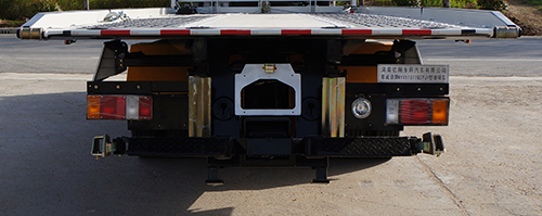 托举质量2605千克。选装车尾部托架型式;选装托板结构;选装平板前部凸起样式;选装后部无上尾板;选装龙门架样式;选装后部伸缩板。ABS及其控制器型号为:APG3550500A4,生产厂家为:浙江亚太机电股份有限公司;装气压制动系统时,ABS系统型号:CM4XL-4S/4M,ABS系统生产厂家:广州瑞立科密汽车电子股份有限公司。侧防护装置材料:Q235B,连接方式:螺栓连接;后下部防护装置材料:Q235B,连接方式:焊接连接,防护截面尺寸(mm)120×50,离地高400mm。该车主要装置为托举平板,用于清除道路障碍。 |