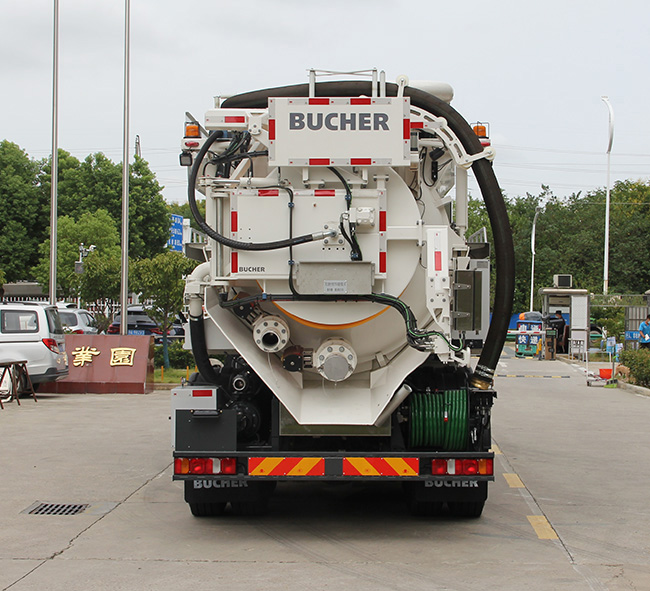 该车专用装置主要为污泥罐和清水罐,用于下水道排污及疏通;随底盘选装限速装置,限速89km/h;该车仅采用轴距为5200+1400(mm);整车后部装有作业指示灯,仅在作业状态下使用;罐体外形尺寸(直径×总长)(mm):1800×5732,其中罐体前端为清水罐(总长2016mm,罐体总容量4.20立方米,有效容积:4立方米,介质:水,密度:1000千克/立方米);后端为污泥罐(总长2466mm,罐体总容量5.25立方米,有效容积:5立方米,介质:悬浮污物,密度:800千克/立方米);污泥罐和清水罐不能同时满载,后防护栏的材料材质:Q235;与车辆连接方式为螺栓连接;侧防护的材料材质:铝合金型材;与车辆连接方式为螺栓连接;后防护截面尺寸宽×高/离地高(mm):106×217/490;ABS系统型号/生产企业:4460046300/采埃孚商用车系统(青岛)有限公司. |