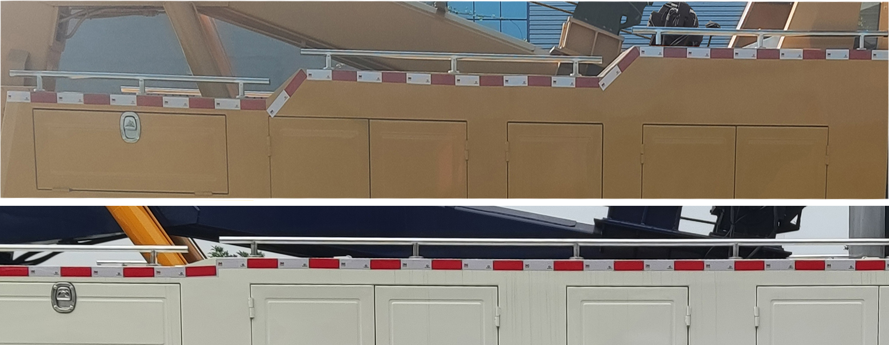 1.ABS型号:446 004 6300;ABS生产企业:威伯科汽车控制系统(中国)有限公司;2.随底盘选装昼间行驶灯,选装保险杠外观,选装高位保险杠,选装踏步,选装前拖钩,选装限速装置,限速79km/h或89km/h,仅用5600,6000mm轴距;3.侧防护由车身结构代替;后部防护由专用装置替代,离地高度430mm;4.专用功能及装置描述:该车主要用于道路清障,主要专用装置为托臂、绞盘、钢丝绳、油缸;托举质量(kg):1940,1875,1770,1705;5.整车外形长/前悬/轴距/后悬对应关系(mm):8950/1550/5600/1800,9350/1550/6000/1800,整备质量(kg)/托举质量(kg)/驾驶室准乘人数(人)对应关系:15930/1940/2,15930/1875/3,16100/1770/2,16100/1705/3;6.选装铝合金护栏,直线式上装结构样式. |