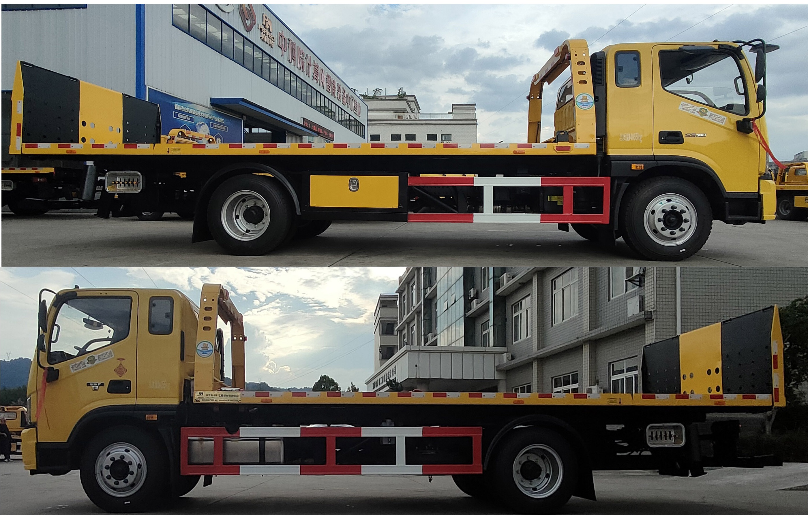 随底盘选装驾驶室包围风格;选装后号牌板安装位置,选装上车坡道装置;ABS系统控制器型号/生产企业:ABS-VI.E/广州瑞立科密汽车电子股份有限公司;侧防护以螺栓连接,材质为Q235;后部防护由专用装置(托臂)代替,材质为Q345/HG60,后部专用装置离地高为:490mm;该车主要用于托移道路故障车辆,城市违章车辆等工作,专用装置:平板总成、绞盘钢丝绳总成、托臂总成及清障专用托具等零部件;平板总成用于背载作业;绞盘钢丝绳总成用于背载、施救过程中拖拽作业,托臂、托具总成用于托牵作业;当整备质量为7600kg时,托举(背载)质量为:6260kg;当整备质量为8300kg时,托举(背载)质量为:5560;安装具有卫星定位功能的行驶记录仪. |