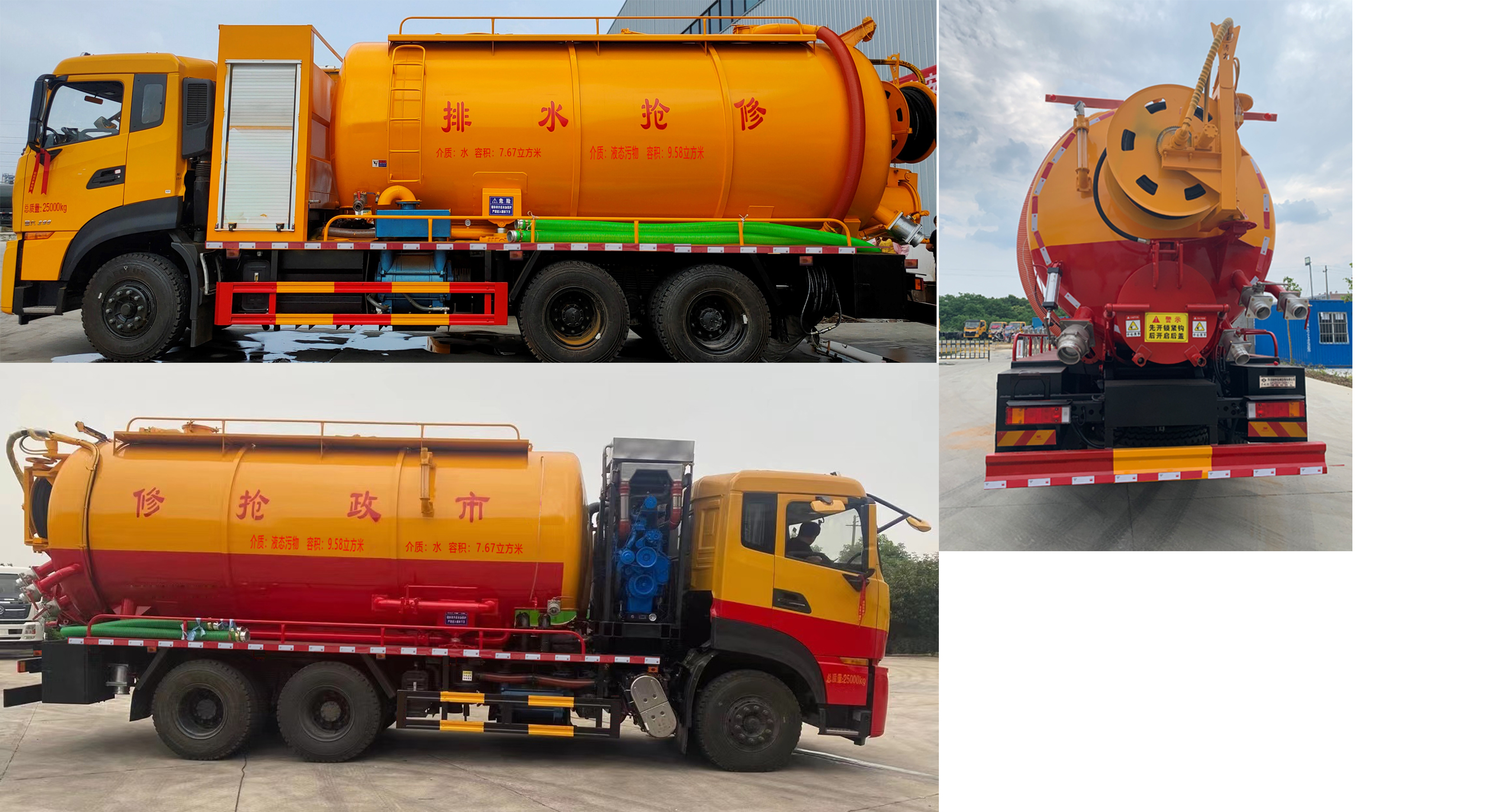 该车专用装置主要由清水罐和污水罐组成,用于下水道排污及疏通,罐体带有举升功能,清水罐和污水罐为两个独立罐体,清洗功能时用清水罐,吸污功能时用污水罐,清洗、吸污两种功能不能同时使用,两个罐体不能同时满载.罐体尺寸为(直段长×直径)(mm):5400×2150,其中罐体前段为清水罐(直段长2400mm),后段为污水罐(直段长3000mm),清水罐总容量7.67立方米,有效容积7.305立方米,污水罐总容量9.58立方米,有效容积9.13立方米.侧、后防护材质为Q235,连接方式:焊接连接,后部防护装置断面尺寸(宽×高):50×220(mm),后部防护离地高度:450mm.仅采用轴距(mm):4350+1350,ABS型号/生产厂家:3631010-C2000/东科克诺尔商用车制动系统(十堰)有限公司,ABS 8/东科克诺尔商用车制动系统(十堰)有限公司,4460046450/采埃孚商用车系统(青岛)有限公司.随底盘选装驾驶室,随底盘选装尾气处理器等样式布局,选装限速装置,限速89km/h.选装不带副发动机罩板,选装吸污臂样式,罐体侧爬梯样式及罐体顶部罐口样式,选装罐体两侧及后部样式. |
