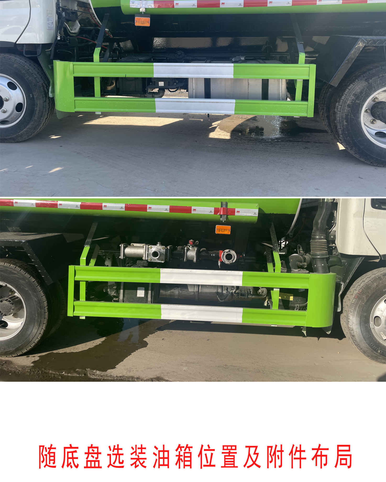 该车主要用于抑尘降霾,主要装置为抑尘雾炮;罐体有效容积:1.7立方米.罐体外形尺寸(长×长轴×短轴)(mm):2600×1700×1250;整车长(mm)/轴距(mm)/后悬(mm)对应关系为:5995/3360/1530,5720/2800/1815;左右侧面防护及后防护材料均为Q235,连接方式都为焊接连接,后防护截面尺寸为:120×50(mm),后防护离地高度:400(mm).ABS系统型号:ABS-VI.E;生产企业:广州瑞立科密汽车电子股份有限公司.ABS系统型号:ABS-E;生产企业:威伯科汽车控制系统(中国)有限公司;ABS系统型号:YF8;生产企业:武汉元丰汽车电控系统有限公司.选装侧面及后部外形样式.随底盘选装油箱、尿素罐、储气瓶、电瓶等附件位置布局. |