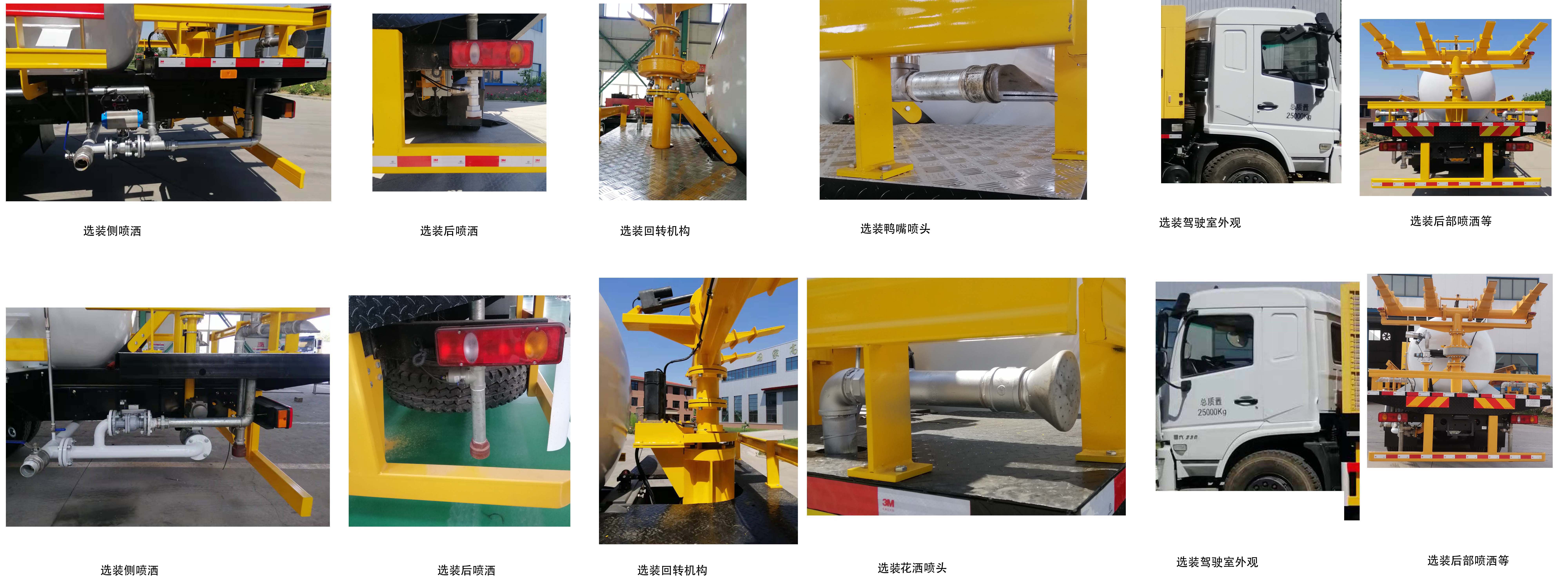 ABS控制器型号/生产厂家:ABS型号/生成厂家:3631010-C2000/东科克诺尔商用车制动系统(十堰)有限公司;罐体有效容积9.0立方米,运输介质为水,罐体总长4850mm,直径1624mm;侧后防护装置材质为Q235A,侧防护与整车副梁用螺栓连接.后防护连接方式为螺栓连接,截面尺寸为120mm×60mm,离地高度为495mm;该车主要专用装置为抑尘降霾装置等,主要用于矿山、道路、拆迁、建设,堆场粉尘等抑尘降霾作业.仅选用轴距(mm):4750+1350,仅选用发动机D6.7NS6B230、B6.2NS6B230、YCS06270-60,随底盘选装驾驶室及前脸、选装后喷洒、喷头、回转机构、侧喷洒样式等 |