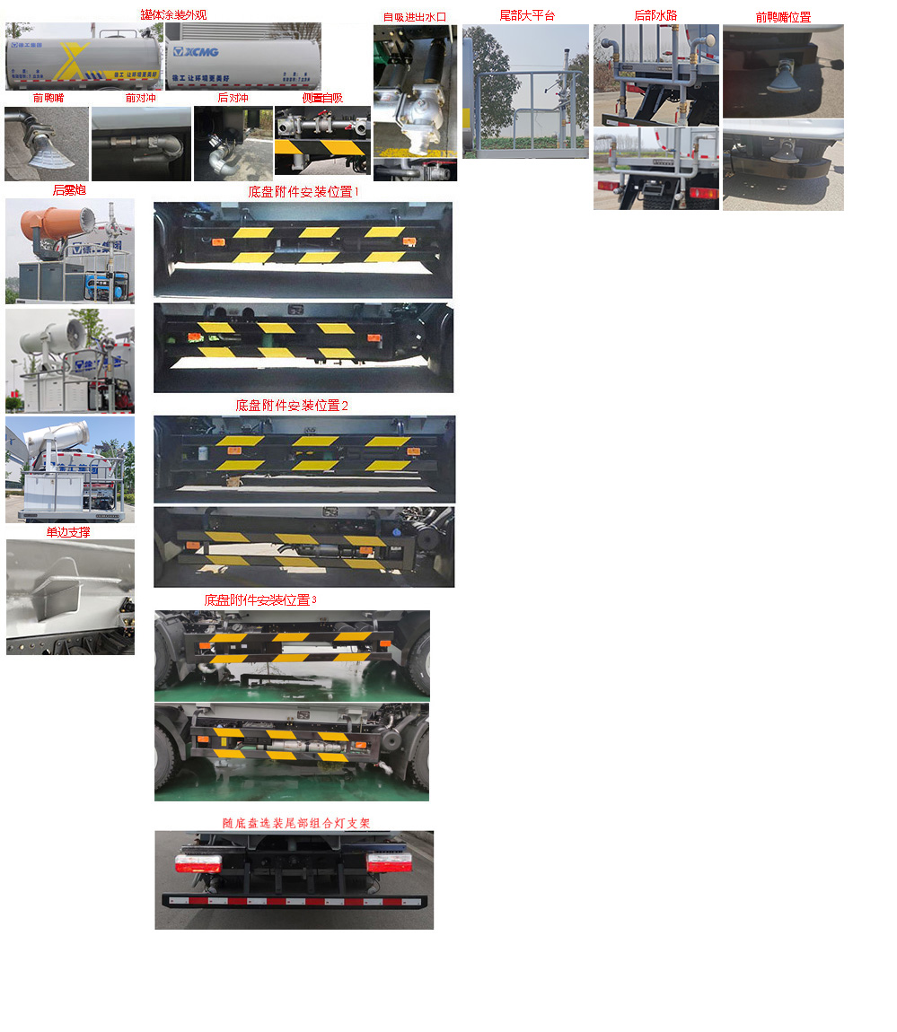 车辆主要装置为水罐、水路及抑尘装置,主要用于城镇园林绿化、固定场所除霾降尘等作业;仅选用3800mm轴距;罐体有效容积7立方米,罐体尺寸(长轴×短轴×长度)(mm):1980×1330×3960;随底盘选装驾驶室;选装罐体涂装外观、鸭嘴、对冲、侧置自吸、自吸进出水口、后雾炮样式、单边支撑、底盘附件安装位置、随底盘选装尾部组合灯支架、尾部大平台、后部水路、前鸭嘴位置,这系列选装对整车尺寸、重量变化可忽略不计;侧防护装置材质为Q235B,连接方式为螺栓连接;后防护装置材质为Q235B,连接方式为螺栓连接,截面尺寸(mm):120×40,离地高度380mm;ABS型号:ABS/ASR-24V-4S/4M,ABS系统生产企业:襄阳东风隆诚机械有限责任公司;选装限速装置时最高车速为89km/h.仅选用245/70R19.5轮胎型号. |