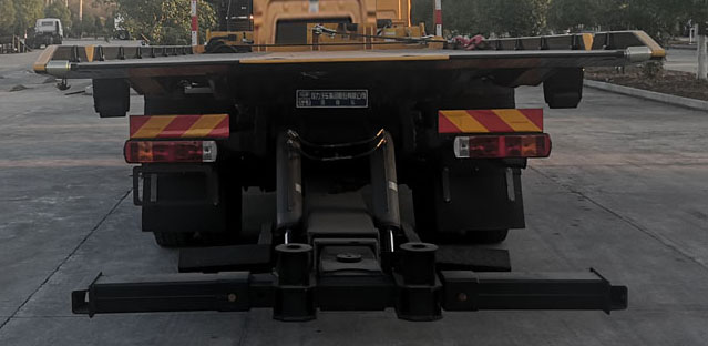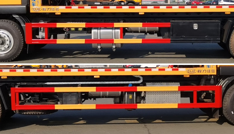 该车主要用于道路故障车辆,城市违章车辆拖运。主要专用装置为托臂、平板、绞盘、钢丝绳、油缸。整备质量12400kg时对应托举质量为:5470kg(2人),5405kg(3人),整备质量13500kg时对应托举质量为:4370kg(2人),4305kg(3人)。整车长度/轴距/前悬/后悬/(mm)对应关系为:11030/6100/1430/3500,10730/5800/1430/3500,10530/5600/1430/3500。所用材料材质、连接方式以及后部防护装置的主要尺寸参数(断面尺寸和离地高度):防护材料:Q235碳钢,连接方式为焊接连接,后下部防护为专用装置托臂替代:离地高为410mm。ABS系统控制器生产企业/型号为威伯科(上海)管理有限公司/4460046300。随底盘选装限速装置,限速89km/h。选装直板外形,选装侧卧绞盘。随底盘选装尿素箱等底盘布局。 |