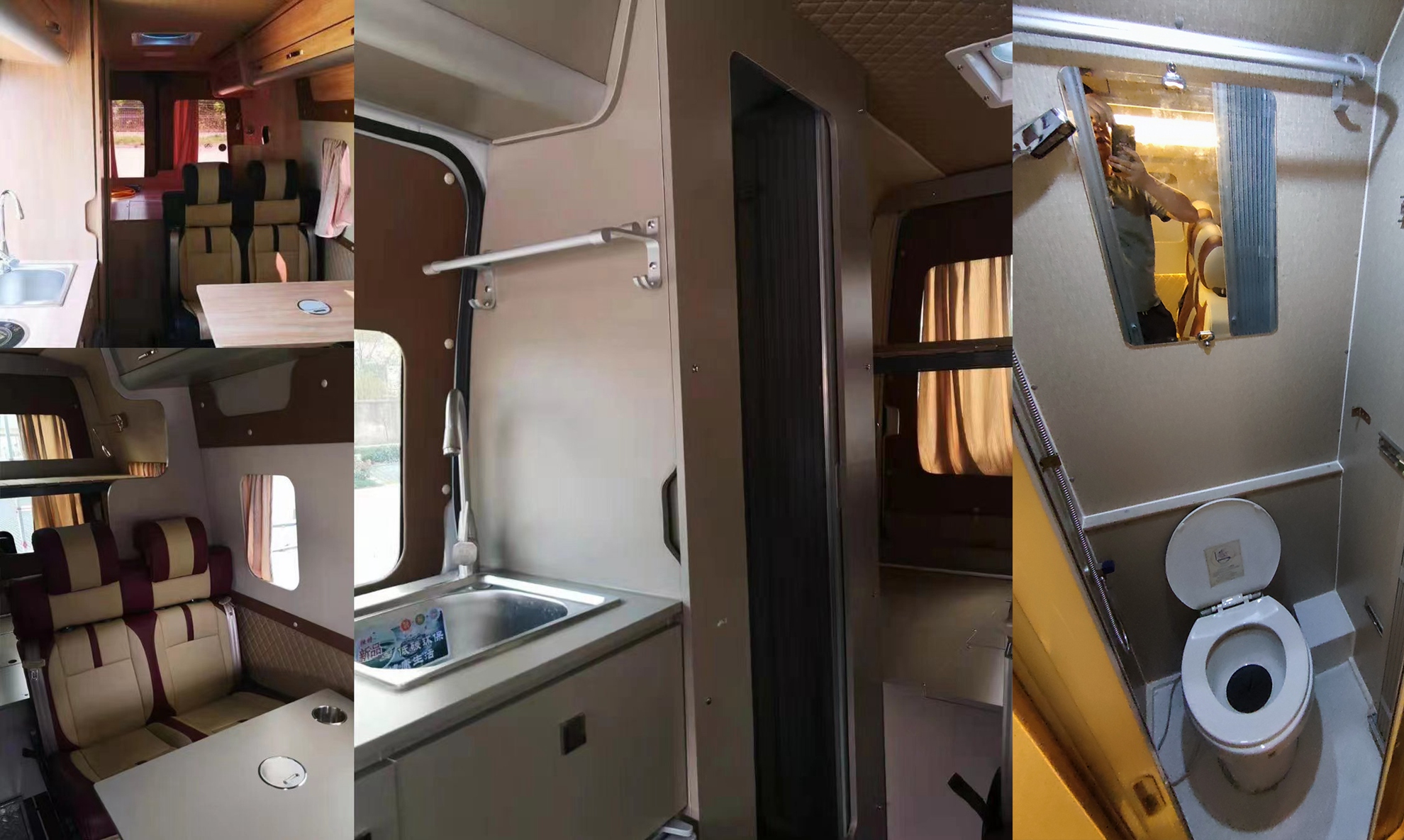 宏运牌上汽大通国六B型旅居车在外观时尚霸气造型圆润流畅,可有效降低风阻系数,整车外形尺寸为5940×2110×2535,2755,2950(mm),房厢采用玻璃钢复合车身结构及阻燃保温材料,做工精细;房厢内部配置齐全,床,洗手间,厨房,冰箱,,储物仓,暖气设备,灭火器等等。