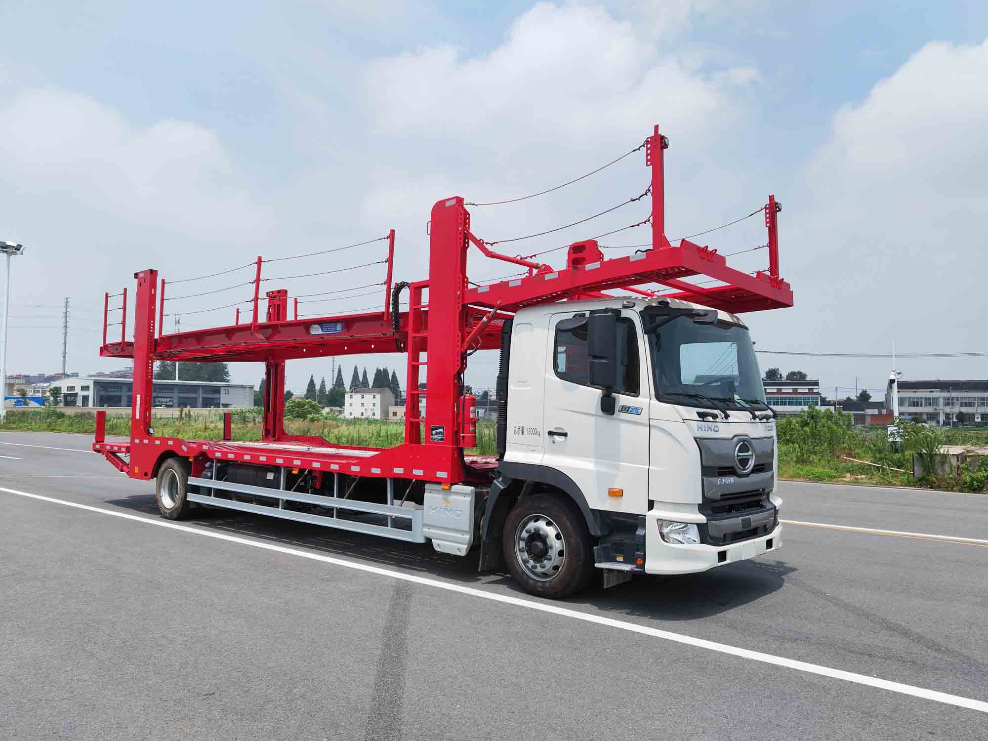 通华牌广汽日野单桥国六五位板车车辆运输车轿运车外观时尚,设计更加科学,外形尺寸为12000×2550×3990(mm),整车的上户吨位为6870,6420,5970(kg),总质量为18000(kg),上装的上层板和下层板之间的距离可以调整,以适应装载不同的车型;低合金高强度钢的上装材质的使用,让整车的质量更轻,承载力更强;采用进口的液压系统,操作简单,安全性大大提高。