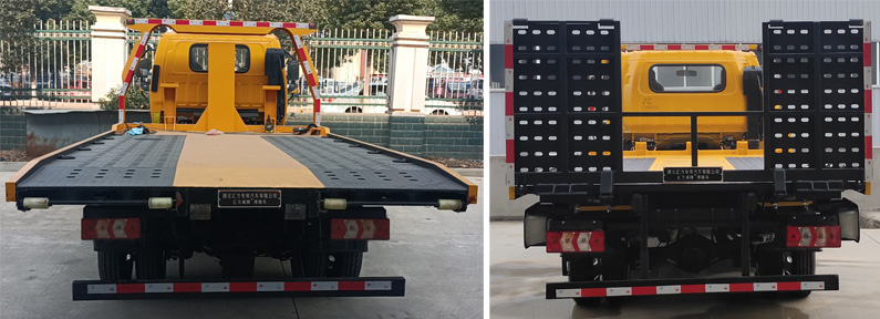主要专用装置为平板、液压绞盘,用于道路清障。该车不具备拖牵功能;选装后部结构;侧防护装置材料材质:Q235,连接方式:螺栓连接,后下部防护装置材料材质:Q235,连接方式:焊接连接,断面尺寸(宽×高):50×100(mm),离地高度为420mm。整备质量包含停车楔、随车工具,不包含备胎、灭火器;ABS型号厂家为YF8/武汉元丰汽车电控系统股份有限公司,ABS型号/厂家:VIE ABS-Ⅱ/浙江万安科技股份有限公司,CM4XL-4S/4M/广州瑞立科密汽车电子股份有限公司。 |