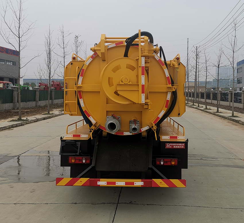 齐东方牌东风华神T3单桥国六11方清洗吸污车的外观简单大气,外形尺寸为7400,7300×2400,2350,2300×3200,3150,3100(mm),额定上户吨位为5630,5565(kg),总质量为14060(kg),整车上装罐体分为污水罐和清水罐两部分,污水罐在中间,清水罐在污水罐的两侧,罐体材料全部采用优质武钢碳钢板制作而成,封头一次压铸成型;整车配备进口高压清洗泵和优质国产吸污泵,吸力大,吸程远,可以将水道内的淤积物轻而易举的搞定。