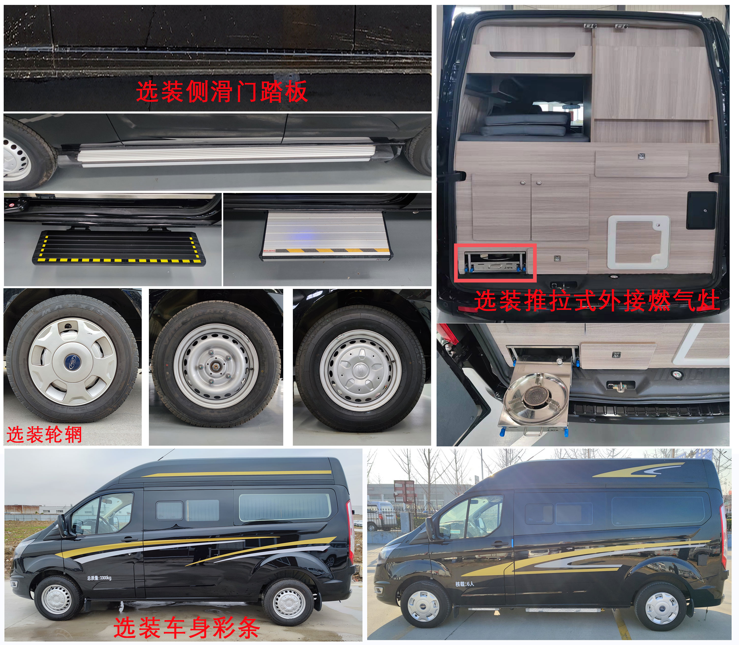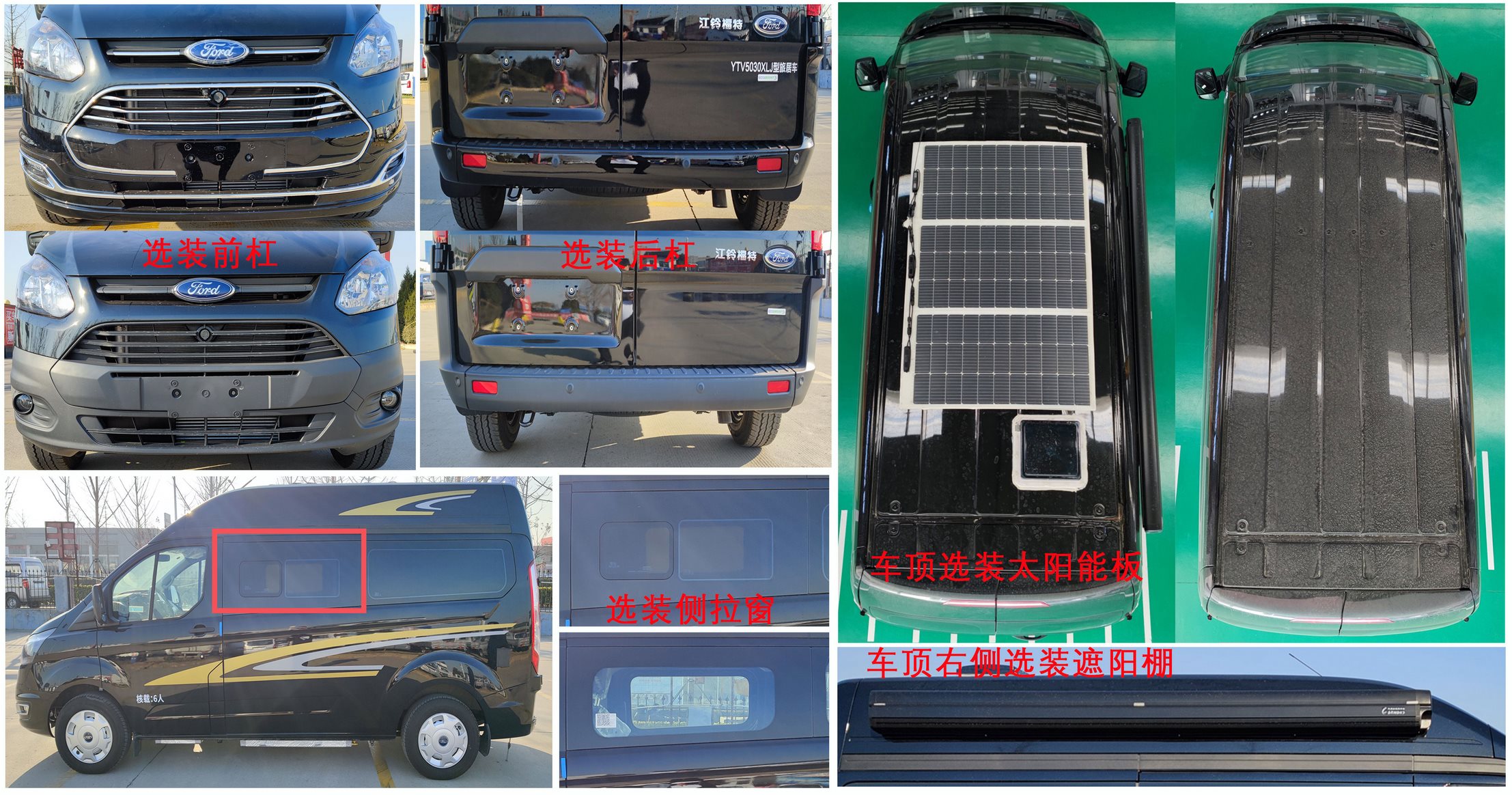 1.车内安装有:伸缩床,炊具,折叠桌板,卫生间等专用设施.2.车顶右侧安装遮阳棚,顶部可选装太阳能板,遮阳棚和太阳能板安装后不改变车身尺寸.3.该车型可选装:轮辋,前杠,后杠,侧踏板,侧拉窗,抽拉式外接燃气灶,车身彩条,非直接供电ETC车载装置.4.座椅布置:2+2+2,第二排三排座椅可翻转放平组成一张床.5.ABS系统控制器型号:EV5051,生产厂:博世汽车部件(苏州)有限公司,发动机最大净功率:147kW.该车配备汽车事件数据记录系统(EDR). |