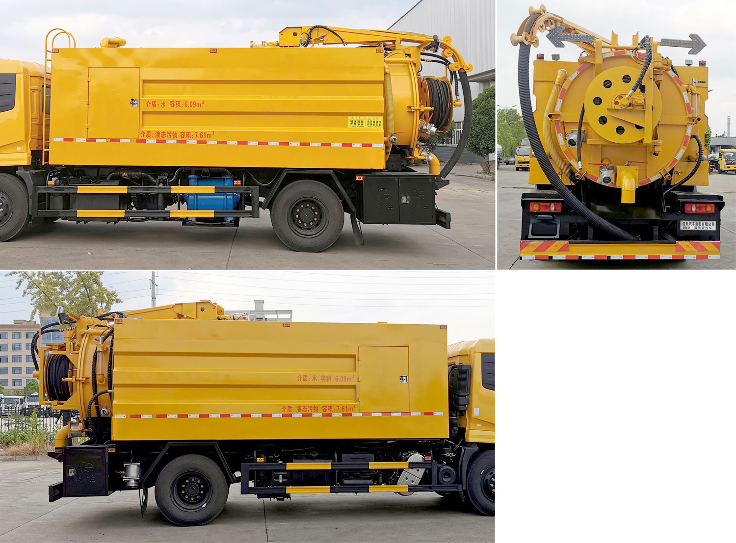 该车主要用于下水道清洗及吸污,主要专用装置为罐体、吸污泵、清洗冲刷装置.圆形罐体外形尺寸:罐体总长度5200mm,其中直段长×直径(mm):4900×1650;罐体前段为清水罐(总长1400mm,其中直段长1100mm),后段为污水罐(总长3800mm).圆形罐体两侧各有一个异型罐,左右对称,均为清水罐,单侧异型罐罐体截面为圆弧及多边形组成,单侧异型罐外形尺寸(长×最大截面宽×最大截面高)为:3500mm×640mm×1100mm.清水罐和吸污罐为两个独立罐体,清洗功能时用清水罐,吸污功能时用吸污罐,两个罐体不能同时满载,两种功能不能同时使用.清水罐总容量6.09立方米,有效容积5.8立方米,污水罐总容量7.61立方米,有效容积7.25立方米,侧、后防护材料均为Q235,侧防护螺栓连接,后防护焊接,截面尺寸(mm)220×50,下边缘离地高420mm.仅选用底盘4700mm轴距改装.随底盘选装限速装置,限速89km/h.ABS型号/厂家:3631010-C2000/东科克诺尔商用车制动系统(十堰)有限公司,ABS 8/东科克诺尔商用车制动系统(十堰)有限公司, 4460046450/威伯科汽车控制系统(中国)有限公司,J ABS/焦作博瑞克控制技术有限公司.随底盘选装驾驶室.选装吸污管臂架,选装后部工作灯,后部作业灯具仅用于作业状态下使用,车辆行驶过程中关闭. |