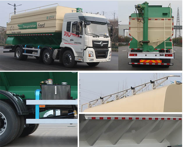 散装饲料运输车主要是从饲料厂向畜牧场、养禽场及饲料加工用户运输散装饲料成品或饲料生产原粮,不仅安全可靠,同时可以都带来非常高的经济回报,所以被广泛的应用于各大中小型养殖企业饲料的运输,下面小编就介绍一下散装饲料运输车中的一种——凌宇牌东风专底小三轴26方散装饲料运输车。