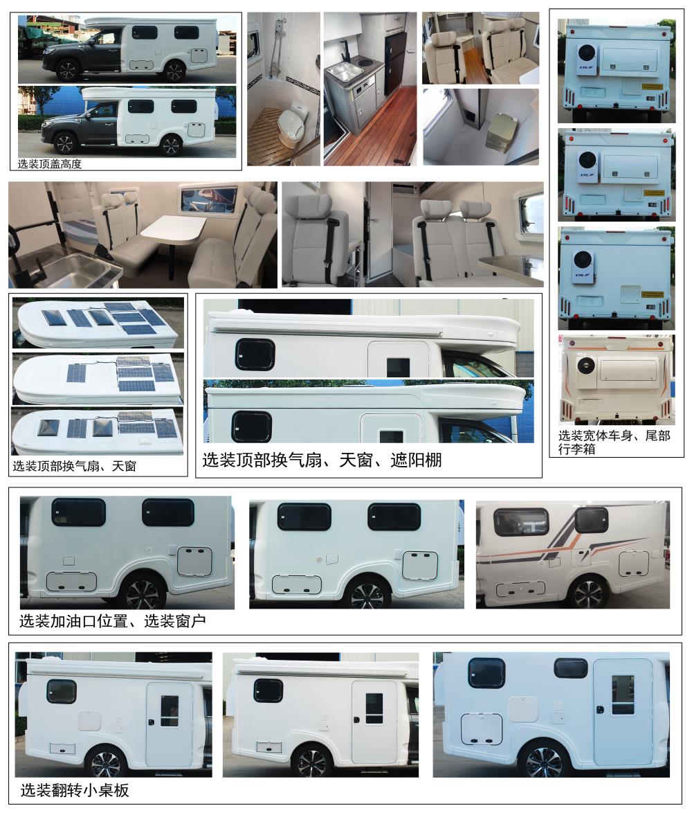 1.该车配备有桌椅、炊事设施、床、卫生设施及必要的照明和空气调节等旅居生活设施,座椅可转换成卧具,顶部为升降顶结构,车辆在行驶过程中顶部不得进行开启或升降操作;2.选装车厢高度,高车厢:顶部无换气扇、无天窗、车顶选装太阳能电池板和不装太阳能电池板时整车高度均为2225mm,选装车顶卫浴换气扇时整车高度为2280mm;矮车厢:顶部无换气扇、无天窗、车顶选装太阳能电池板和不装太阳能电池板时整车高度均为2195mm,选装车顶卫浴换气扇时整车高2250mm;3.选装车厢宽度,宽厢体:车体右侧选装遮阳棚时整车宽度为2300mm,不装遮阳棚时整车宽度为2260mm;窄厢体:车体右侧选装遮阳棚时整车宽度为2200mm,不装遮阳棚时整车宽度为2160mm;4.厢体两侧可选装窗户位置和数量及外观;选装侧面和后部仓门及外置餐板;选装内部布局;后围可选装窗户、换气扇、行李箱;选装顶部换气扇位置;5.整备质量/乘员人数对应关系:3082kg/6人,3150kg/4-5人; 6.仅选用后围板开口开孔底盘,随底盘选装前围、轮辋;ABS型号:MGH100 MOCSi,ABS生产企业:万都底盘部件(苏州)有限公司。 |
