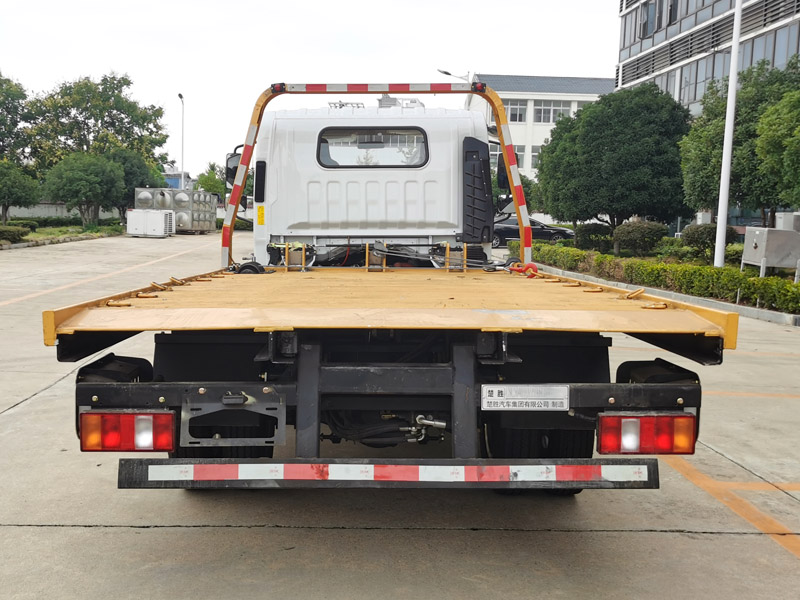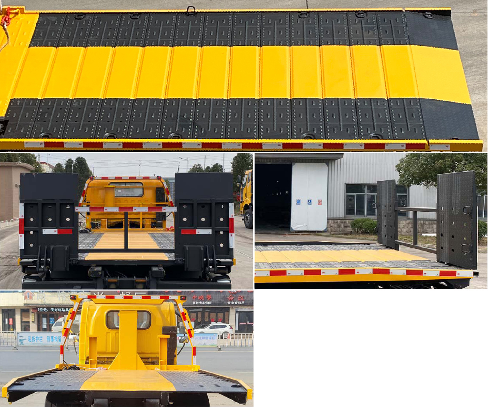 该车主要用于道路清障,主要专用装置为平板、绞盘、钢丝绳、油缸.该车无托牵功能.侧防护材料为Q235,螺栓连接;后防护材料为Q235,焊接,截面尺寸(mm):100×50,下边缘离地高420mm.液刹ABS系统型号/生产厂家:3550A500/浙江亚太机电股份有限公司,APG3550500A/浙江亚太机电股份有限公司,气刹ABS系统型号/生产厂家:CM4XL-4S/4M/广州瑞立科密汽车电子股份有限公司.随底盘选装前部标识.选装前雾灯.选装不带前雾灯.选装轮辋.选装不带车轮装饰罩.选装铝合金轮辋.该车整备质量对应的配件包括随车工具、三角垫木等,不含备胎.选装龙门架样式及滑轮座样式,选装后尾板. |